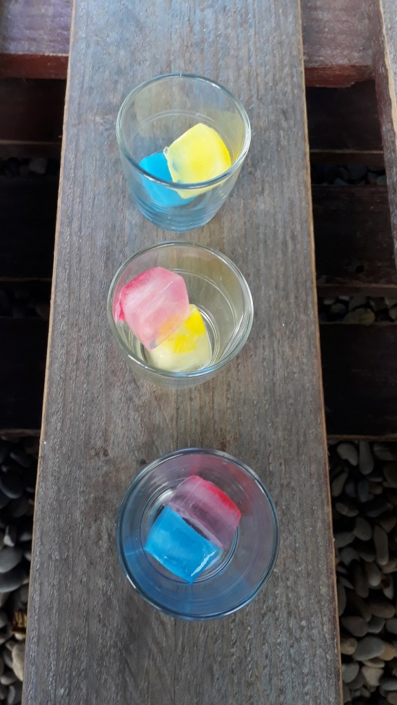 C’est amusant et rafraichissant pour l’été. Sur le papier aquarelle, on voyait bien qu’après passage d’un glaçon bleu, puis d’un rouge, on obtenait du violet. Mais c’est encore plus flagrant en laissant fondre deux glaçons ensemble dans un verre.