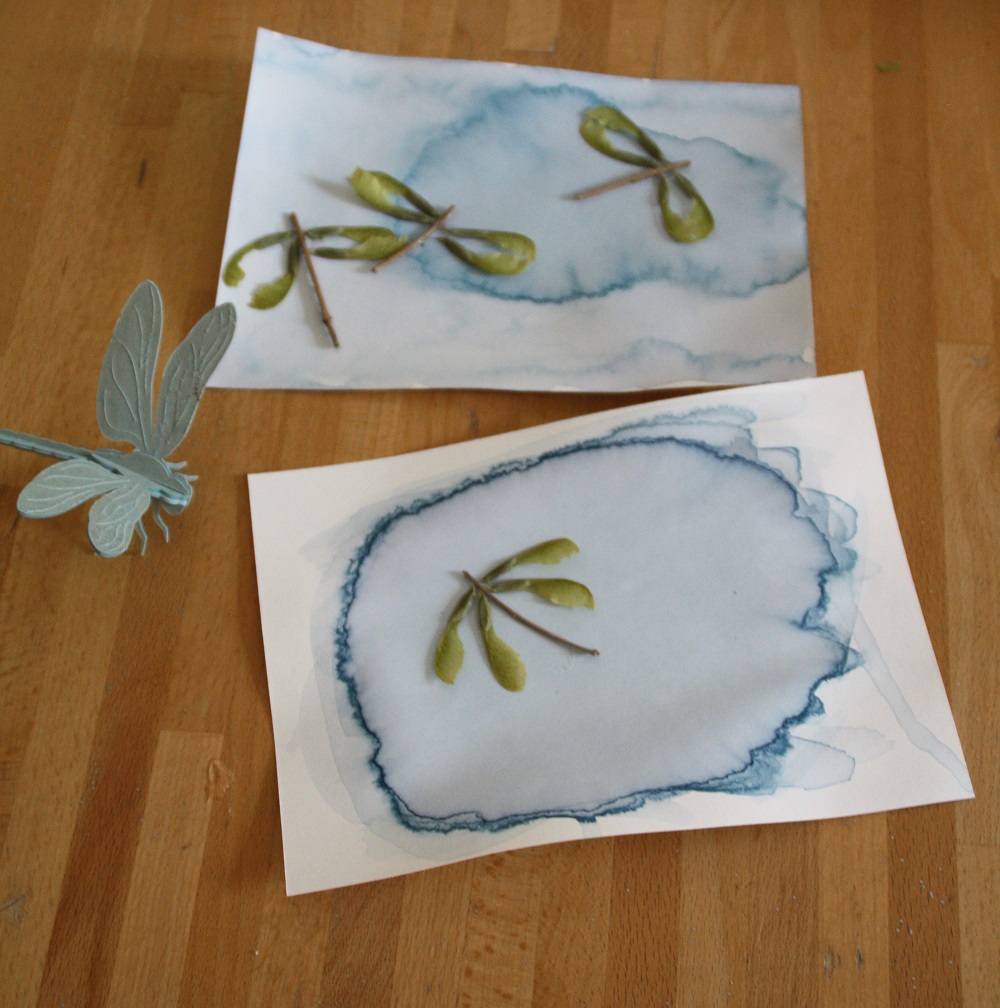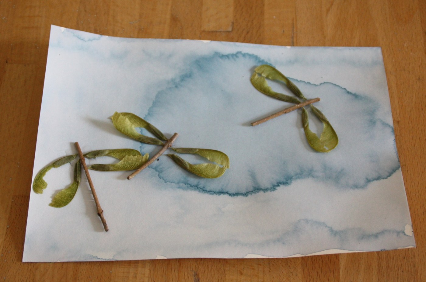 Un peu de colle et voici nos mares aux libellules (celle de la cadette avec 3 insectes ailés et la mienne).