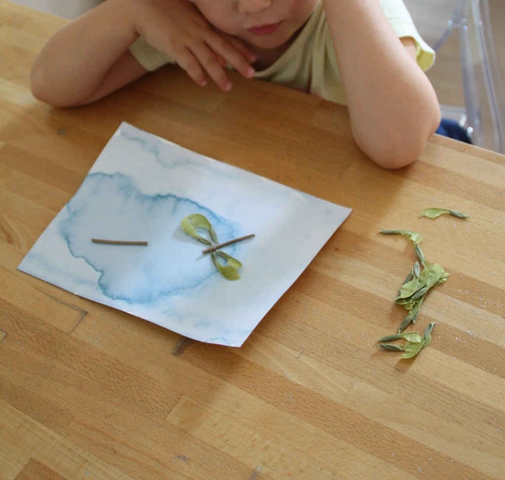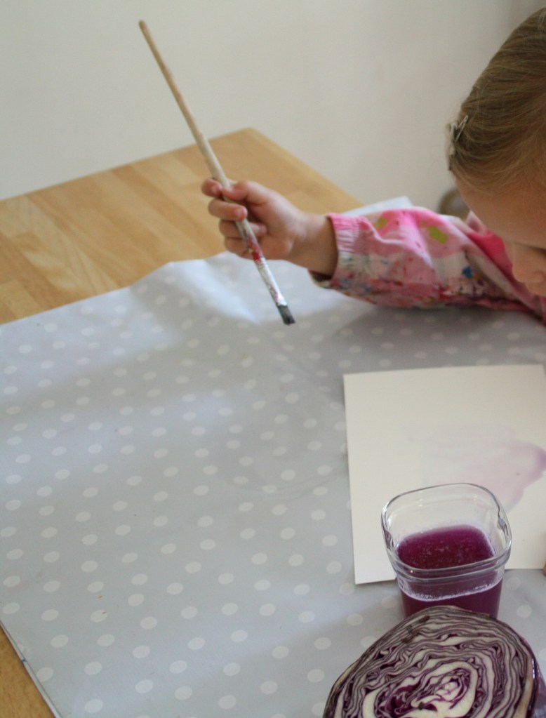 Cela nous a donné l’idée de reproduire avec des éléments naturels cette mare (ou rivière) aux libellules. Pour représenter le bleu de la mare, nous avons opté pour la peinture au chou rouge. J’ai laissé infuser les premières feuilles du chou rouge (trop dures pour la salade) dans de l’eau chaude. Cela donne un liquide violet, mais qui vire au bleu dès qu’on l’étale sur le papier aquarelle. Bon, j’ai voulu conserver cette peinture naturelle pour le lendemain, mais cela dégage une très forte odeur de chou.