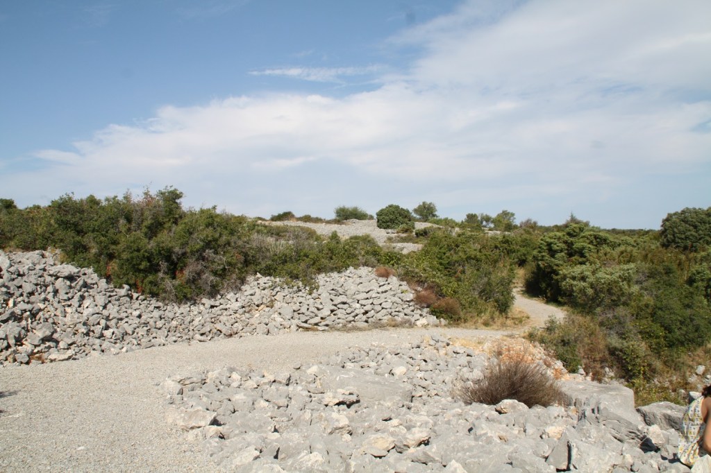 Le sentier n’est pas long, 1 kilomètre à peine au milieu des pierres et de quelques meules abandonnées. La végétation de garrigue ne permet pas de faire de l’ombre l’été ; il vaut mieux y aller un jour pas trop chaud.