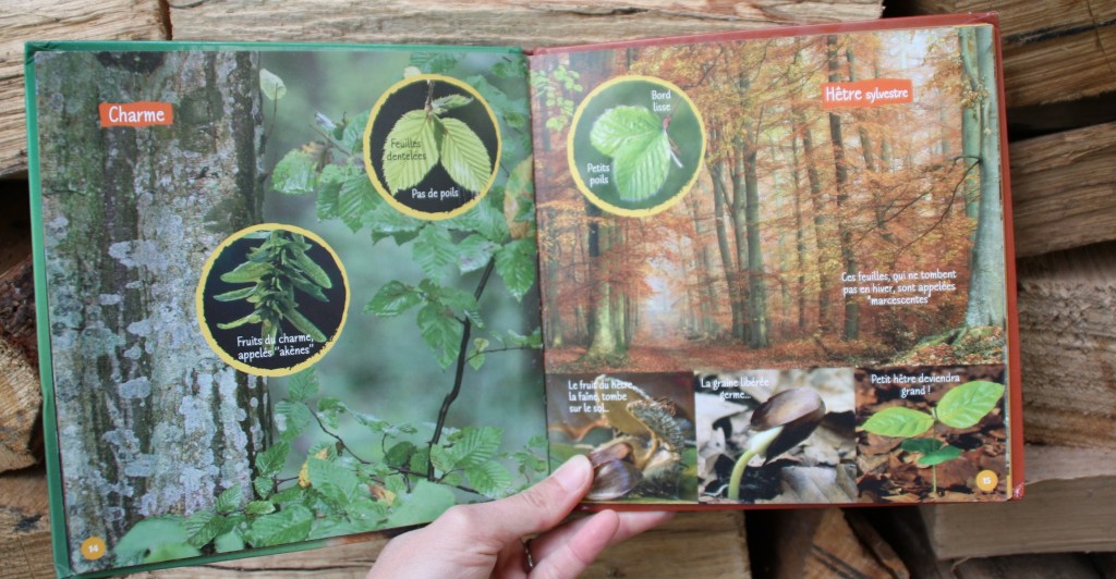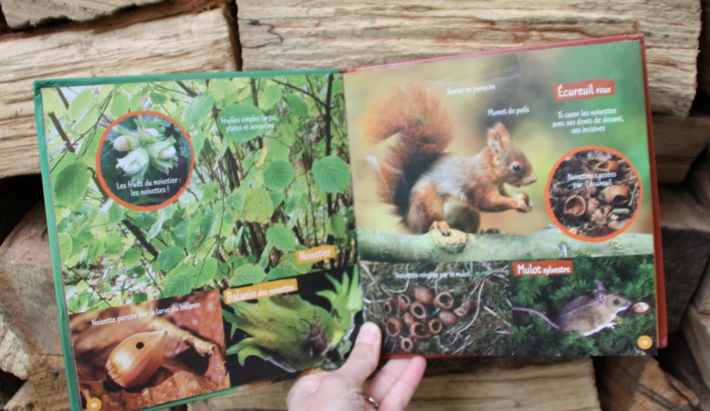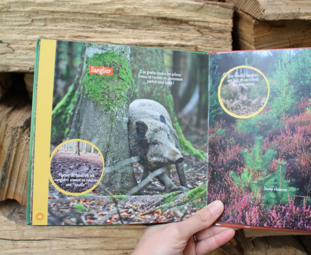On y trouve une mention des chenilles processionnaires ; il y a en a dans notre région et c’est donc utile de prévenir les enfants de leur danger. On y parle des traces que les sangliers peuvent laisser sur les arbres près des mares de boue ; c’est quelque chose que nous avions observé lors d’une sortie en forêt avec la classe de l’aînée. On y découvre le cycle du chêne à partir du gland tombé au sol… Je vous laisse découvrir quelques pages.