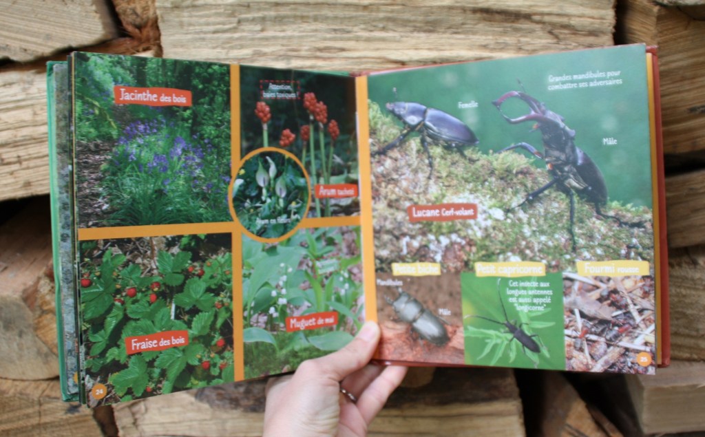 Ce n’est pas un gros volume (une quarantaine de pages), cependant je le trouve assez complet. On y parle animaux (du mammifère aux insectes) et végétaux (de l’arbre au champignon)… avec juste le texte nécessaire pour les petits en maternelle. Alors, il existe beaucoup de documentaires jeunesse sur la forêt, les arbres ou les animaux de la forêt, mais il y a dans ce livre-ci des informations rarement données.