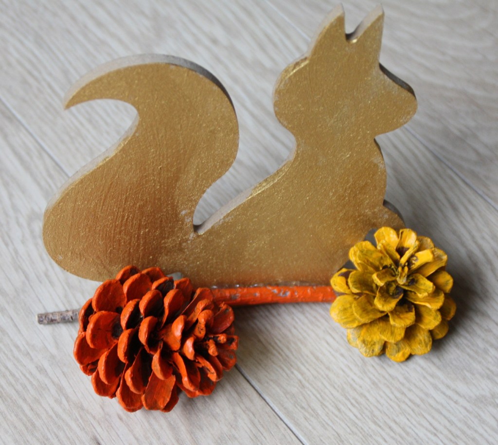 Pour l’écureuil, j’aurais pu aussi découper la silhouette de l’animal dans du carton épais, mais j’en avais trouvé une en bois. Elle l’a peinte en doré et a peint aussi deux pommes de pin dans des tons d’automne. Avec un pistolet à colle, j’ai assemblé le tout afin que l’écureuil tienne droit. Et voici notre deuxième animal.