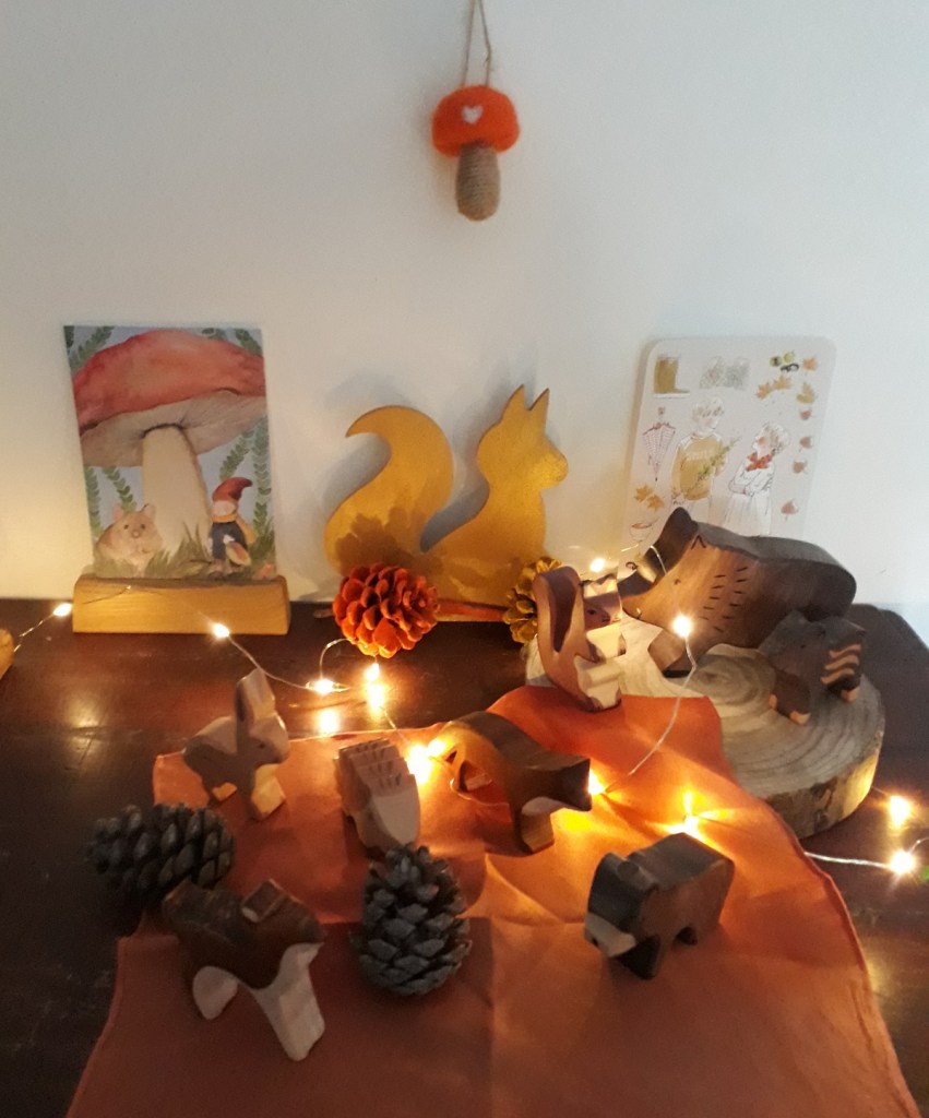 Sur la table des saisons cet automne, il y a un hérisson et un écureuil bricolés par la cadette (4 ans).