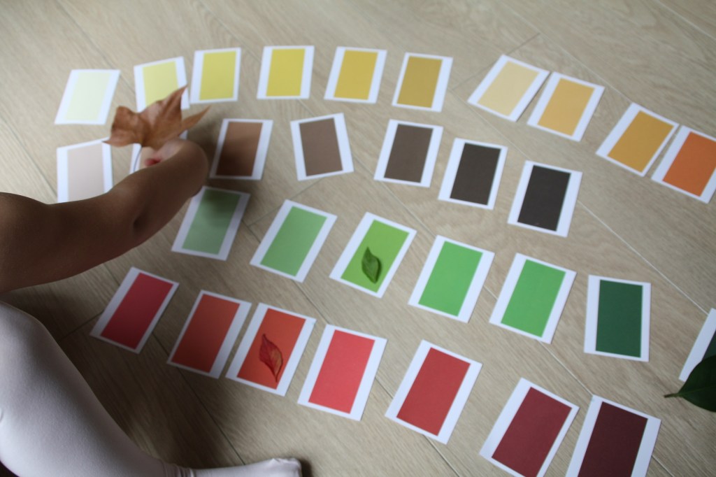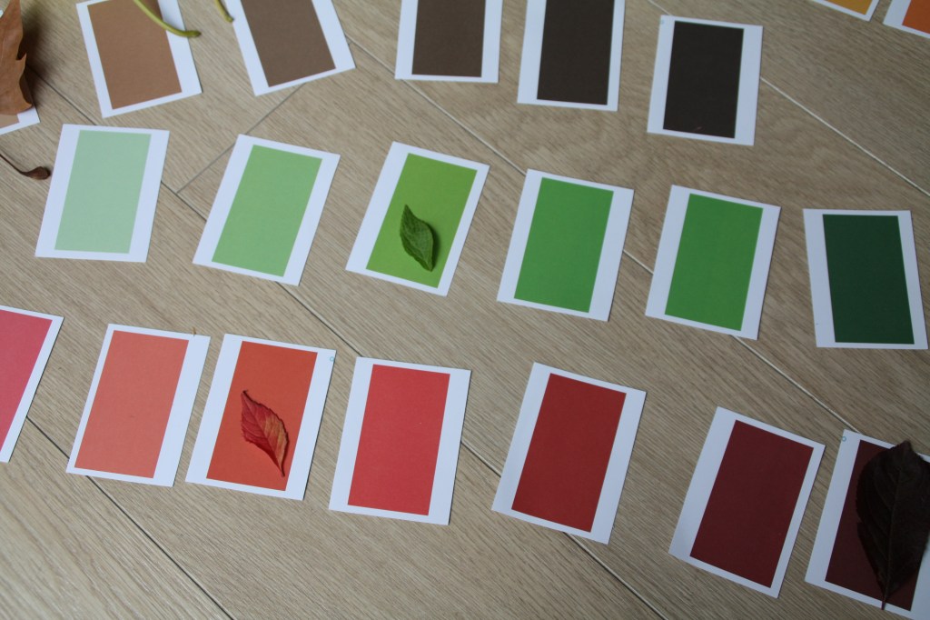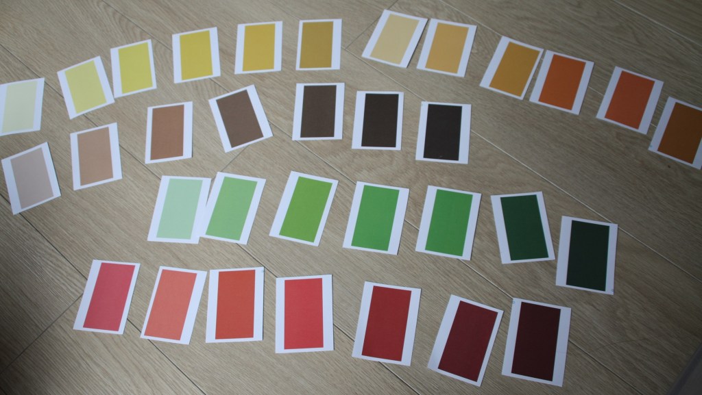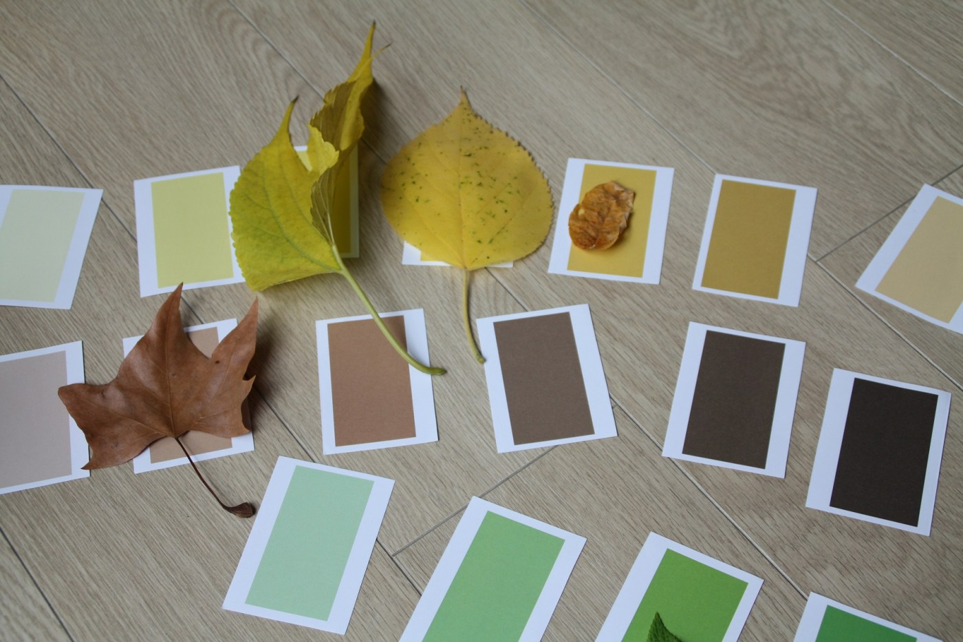 Si vous aimez jouer avec l’art, je vous conseille de découvrir SapARTlipopette. Elle suggérait récemment de prendre le temps de contempler la nature et les palettes de couleur d’automne. Elle avait accompagné sa publication d’une photographie d’un nuancier et de feuilles mortes. Cela m’a inspiré ce jeu. J’ai sorti nos cartes des couleurs : les tons de jaune, orange, rouge, marron et vert (parce que certains arbres ont un feuillage persistant). Nous les avons classés du plus clair au plus foncé. Et nous avons essayé d’associer des feuilles d’arbre trouvées dans le jardin à la carte de couleur se rapprochant le plus.