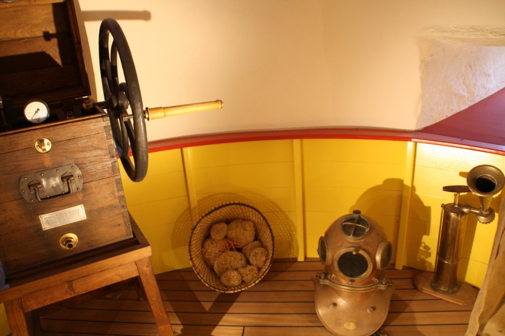 A l’intérieur se trouve un superbe musée sur l’histoire maritime de la ville des bateaux de pêche à la construction navale militaire ou la navigation de plaisance, en passant par la pêche aux éponges en scaphandre. Nous avons été agréablement surpris par la scénographie de ce musée. Chaque salle est mise en scène avec des décors et de nombreux objets (certains offerts par des habitants) ce qui plait aux enfants. On a parfois l’impression d’être au bord d’un bateau avec un morceau de mat ou en pleine tempête en regardant un film projeté au plafond.