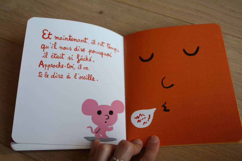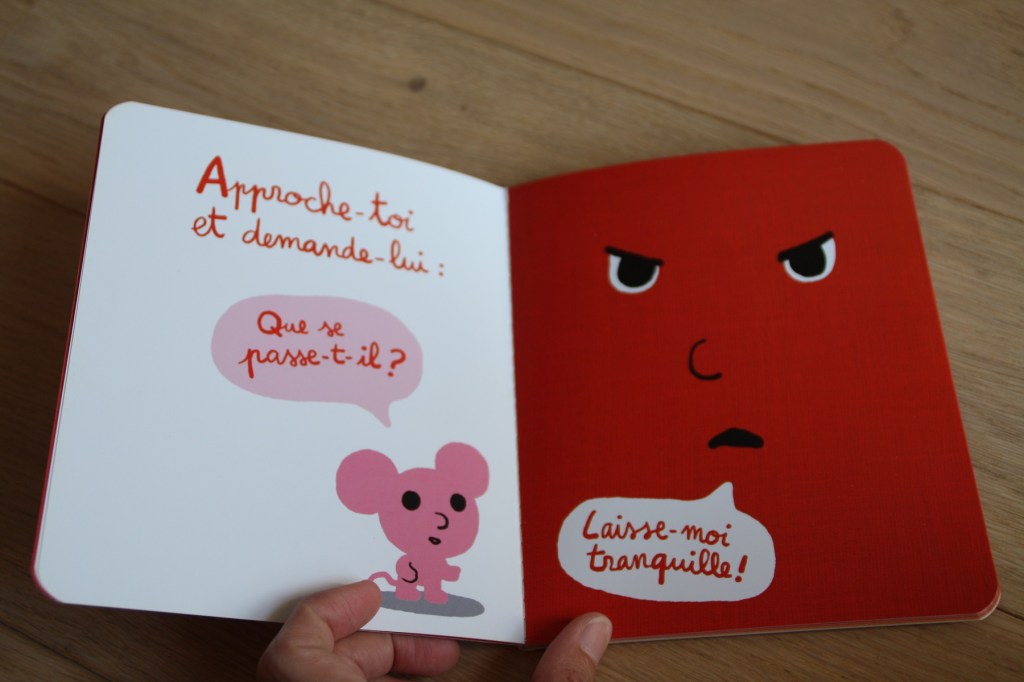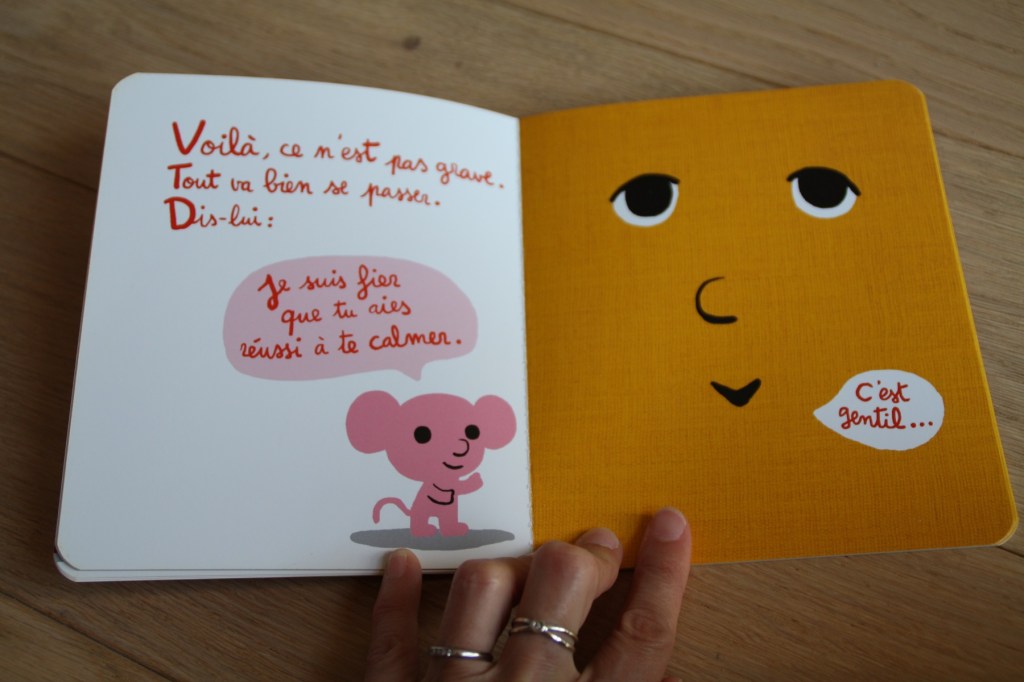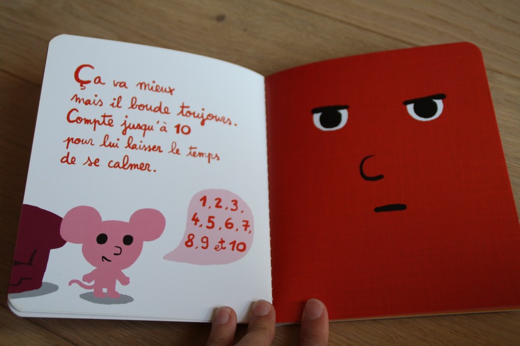 C’est au départ l’histoire d’un livre très en colère que l’on va aider à se calmer ; mais en faisant cela c’est l’enfant qui va se calmer. Comment ? En lui laissant s’isoler, en comptant lentement jusqu’à 10 pour faire retomber la pression, en expliquant à voix basse qu’elle est la raison de cette colère et en faisant sourire (notamment lorsqu’on traite le livre de « grosse tomate »). Bien sûr, ce n’est pas avec un livre que l’on va résoudre toutes les grosses ou petites crises. Cependant, la lecture de ce livre a permis de calmer les pleurs de la cadette et de pouvoir ensuite dialoguer plus aisément avec elle pour comprendre l’origine de cette émotion.
