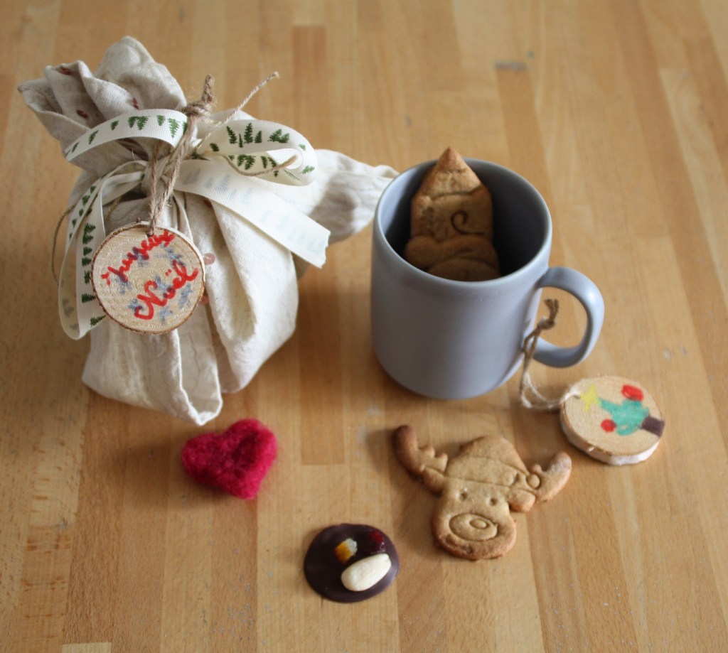 Pour le contenant, j’avais trouvé des grande tasses (une des anses m’est restée dans la main, j’ai pris un bocal en céramique à la place). Nous les avons ensuite emballées dans du tissu avec un morceau de ruban décoré de sapin et de la ficelle dorée (zéro déchet). Les filles ont décoré des rondins de bois avec des marqueurs et l’aînée a aussi fait un petit cœur en laine feutrée (jusqu’à ce que l’aiguille à feutrer casse).