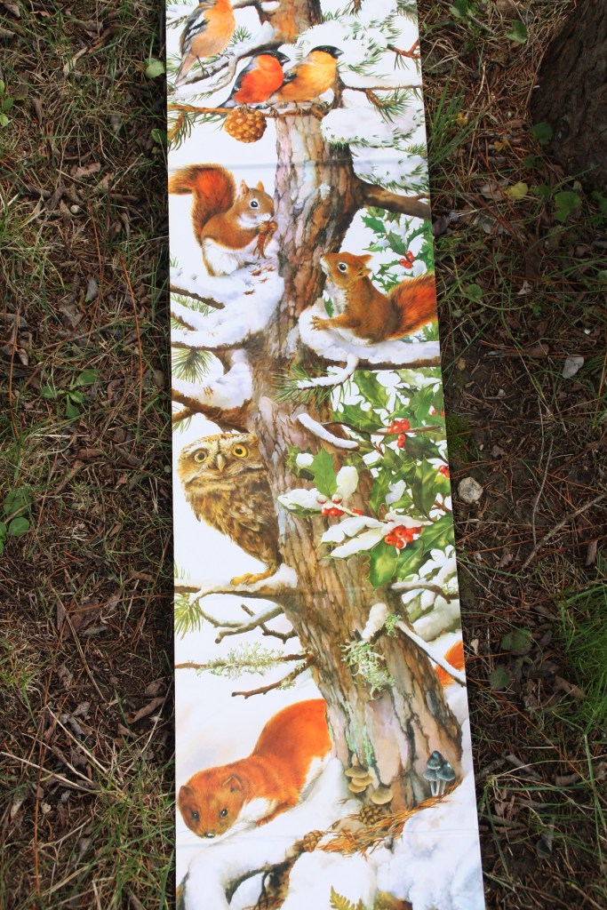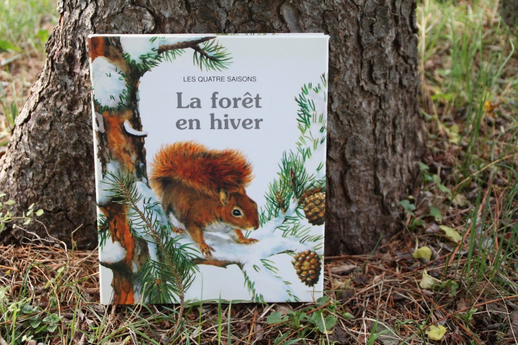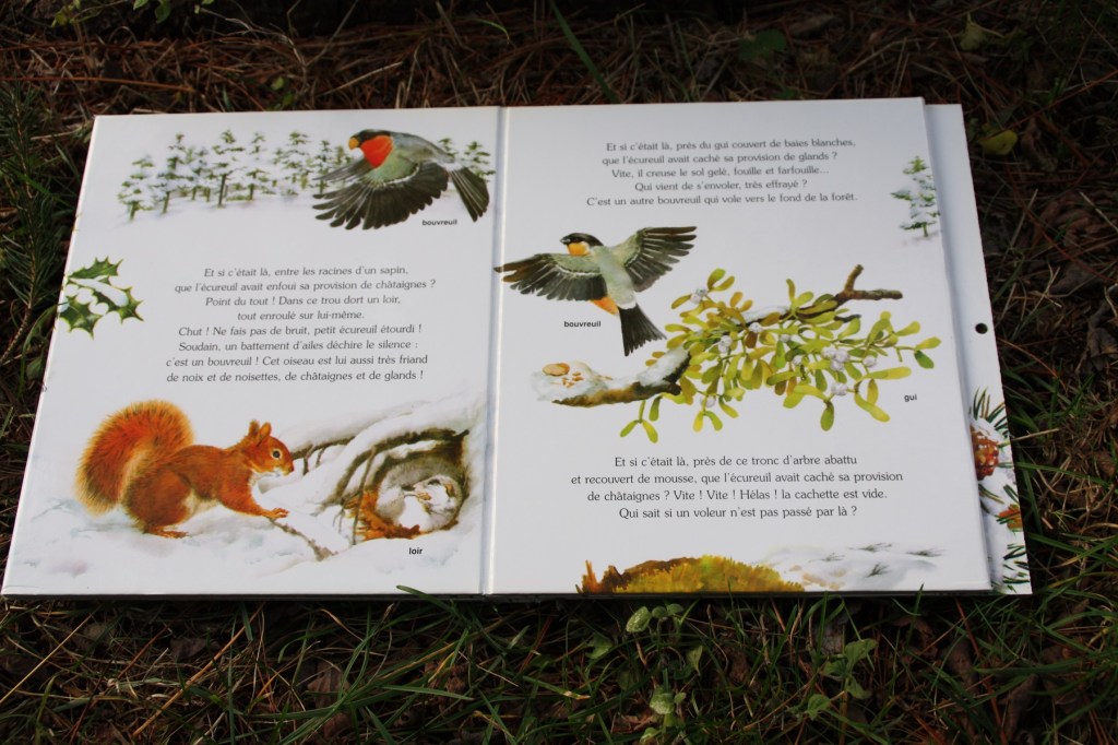 Je trouve que cela se rapproche du documentaire car les illustrations sont très réalistes, tout comme l’histoire. Sur a dernière page, on trouve les silhouettes de plusieurs petits animaux vivants dans la forêt. Et on les retrouve tous le long du tronc du conifère enneigé, sur la très grande image à déplier : rouge-gorge, bec-croisé, mésange charbonnière, bouvreuil, chouette, pic épeiche, rat des champs, musaraigne, belette et bien sûr écureuil.
