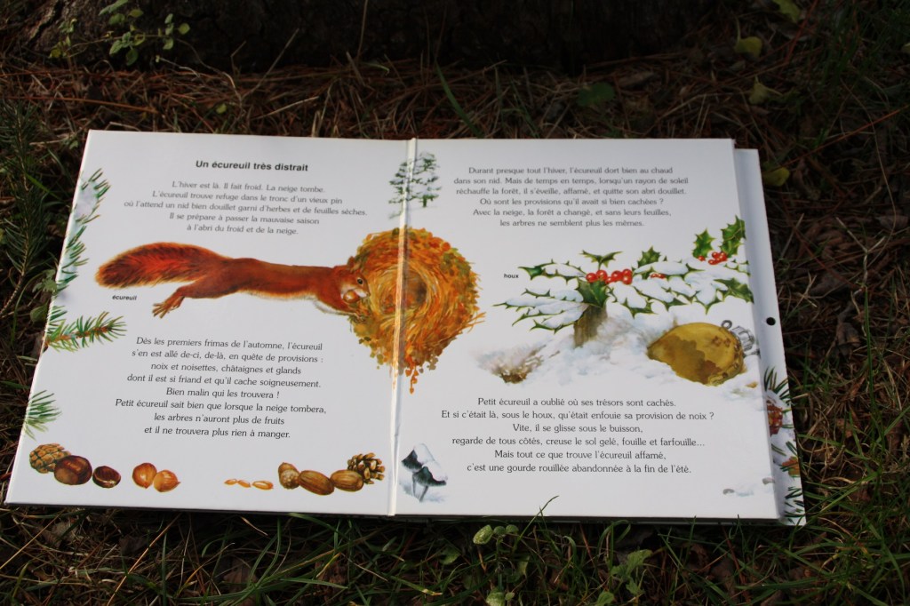 Avant l’hiver, l’écureuil fait des provisions qu’il cache par-ci, par-là. Mais comme il est distrait, lorsqu’il se sort de son nid, il ne sait plus où sont châtaignes, glands, noix et noisettes. Dans sa recherche, il croise le loir endormi, le bouvreuil ou d’autres oiseaux.