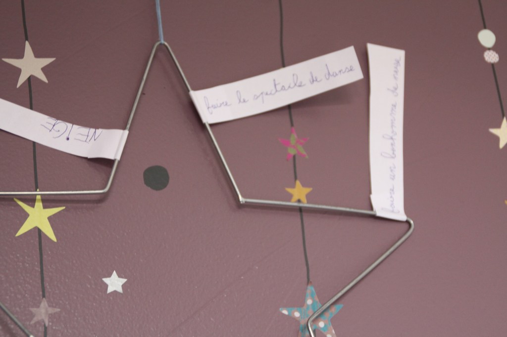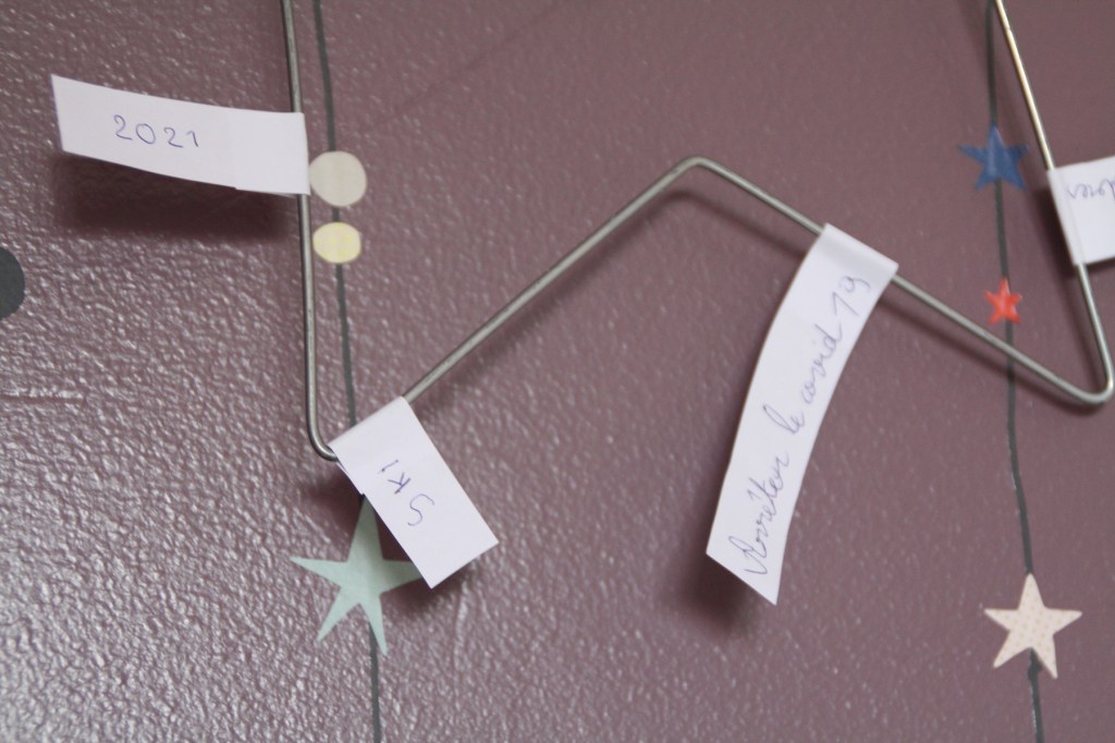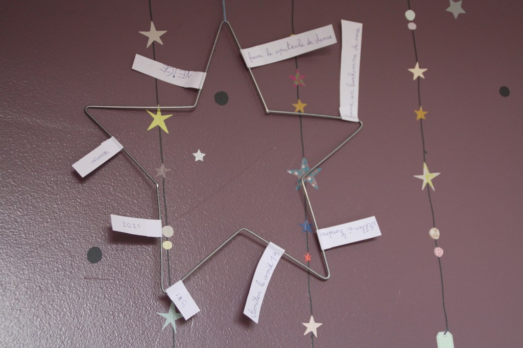 Des rêves réalistes, mais pour certains soumis à la situation sanitaire. Chacun a noté sur un simple morceau de papier blanc et collé sur une étoile en métal. Pour l’instant (on a le droit de faire des vœux toute l’année, non ?), il y a :