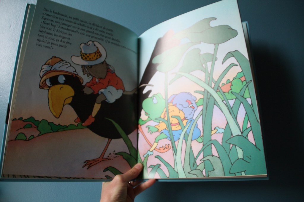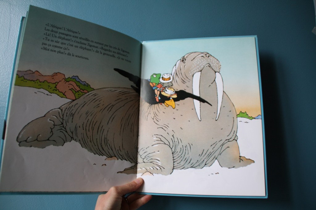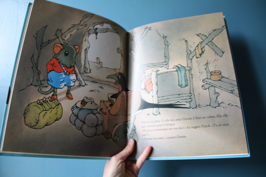L’histoire est en effet amusante. Pipioli (déjà le nom fait sourire) est un souriceau, ami avec une hirondelle. C’est bientôt l’hiver et son amie Ginette se prépare à migrer vers l’Afrique. Pipioli aimerait tant partir avec elle, mais il est bien trop lourd pour monter sur son dos. Heureusement, Zigomar le merle lui propose de l’emmener sur ce continent. Une grenouille fait aussi partie du voyage. Mais dès le départ, Pipioli s’étonne : pourquoi volent t-ils en sens inverse des oies ? Enfin, l’Afrique est là. Mais quelle drôle d’Afrique. Les éléphants ressemblent à des morses, les hippopotames à des rennes, les singes à des pingouins… et il y fait drôlement froid. Zigomar ne se serait-il pas trompé de chemin ? Zigomar vexé menace de laisser ses passagers ici. Attention un lion attaque, mais est-ce vraiment un lion ? De retour de voyage, Pipioli raconte à ses parents que l’Afrique ressemble beaucoup au Pôle Nord : « je ne voyais pas ça comme ça ! « .