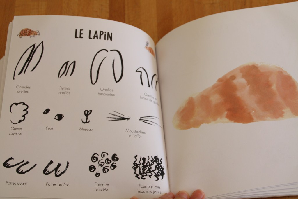 J’ai trouvé un livre à la bibliothèque qui proposait de dessiner des animaux. Contrairement à des pas à pas soit à base de formes géométriques, soit en commençant par une silhouette, ce livre suggère de faire d’abord une forme en peinture, une forme peu précise, qui ressemble presque à une simple tache. Et puis, il y a plusieurs exemples de détails comme les pattes, le pelage, le museau… pour métamorphoser cette tache en animal.