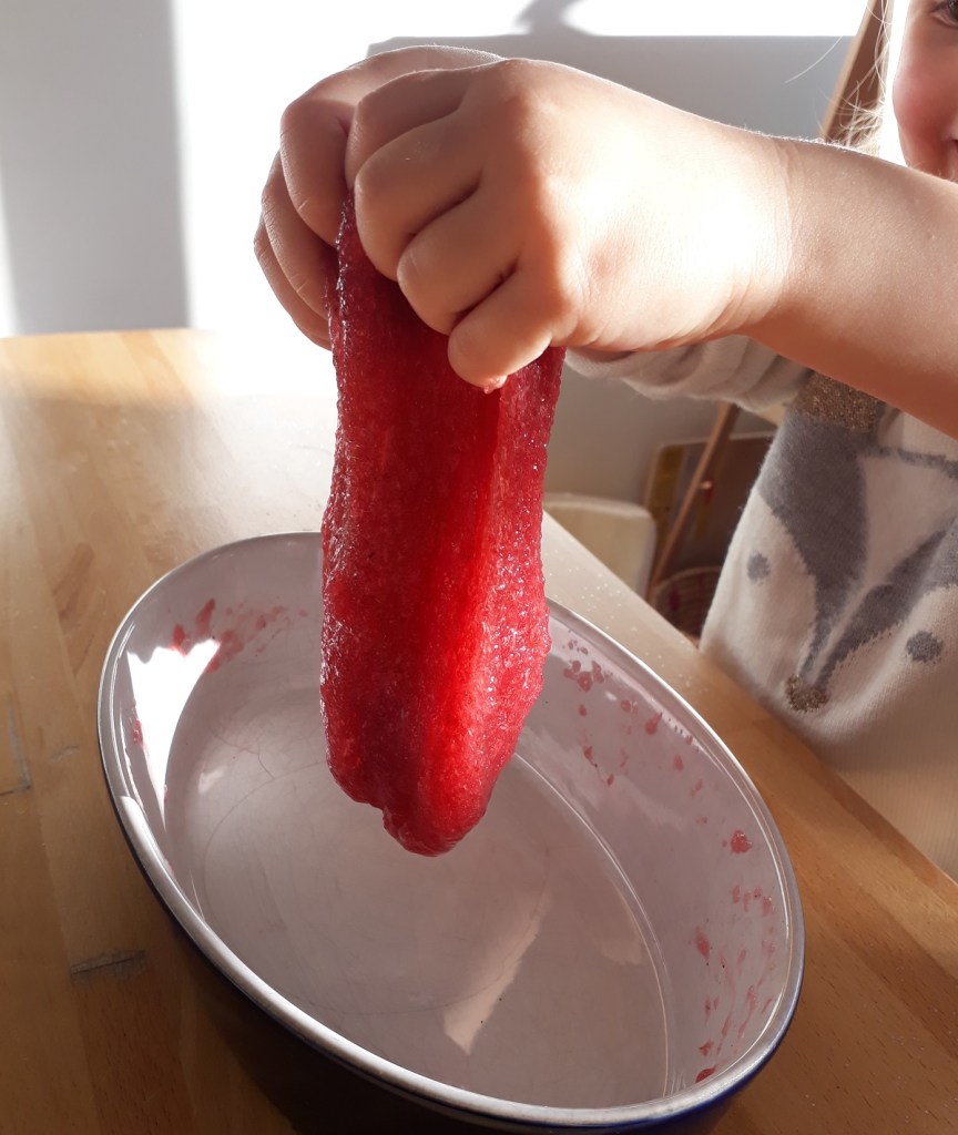 Il suffit de mélanger tous les ingrédients dans un plat et de faire chauffer 1 minute à 1 minute et demi au four micro-ondes. En refroidissant, la pâte prend sa texture visqueuse qui plaît tellement aux enfants. Il n’y a plus qu’à s’amuser à la manipuler.