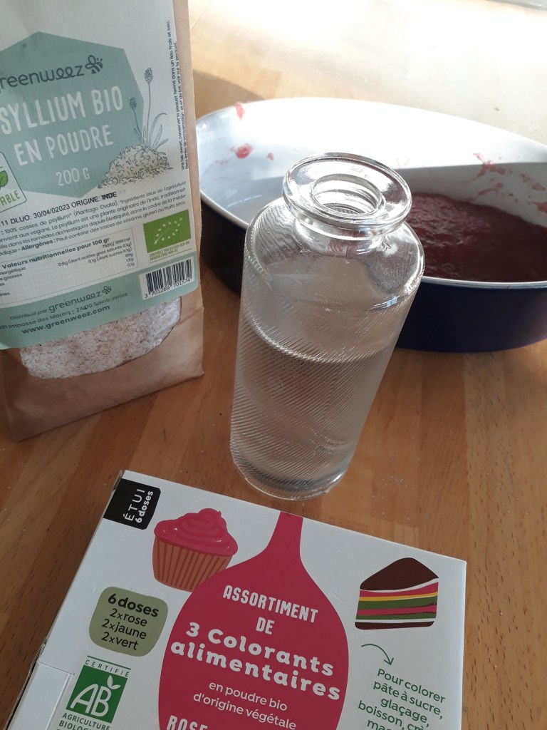 - Du colorant alimentaire (j’ai utilisé du colorant en poudre, une cuillère à soupe rase)