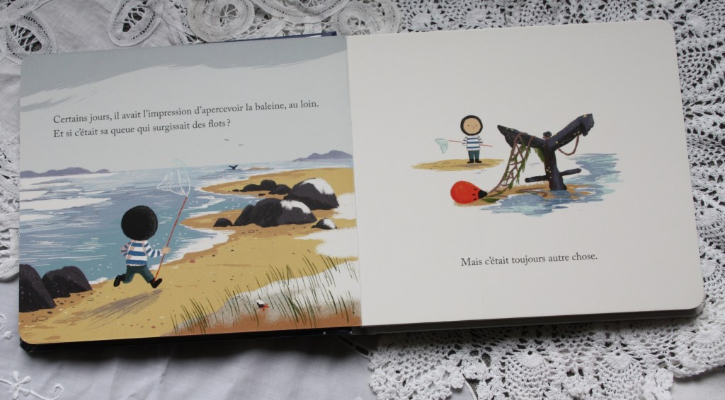 J’aurais peut-être du vous parler d’abord du livre L’enfant et la baleine avant L’enfant, la baleine et l’hiver. Pour résumer ce premier livre que nous avions lu il y a quelques semaines : Noé vit au bord de la mer avec son papa pêcheur. Après une nuit de empête, Noé trouve une baleine échouée sur la plage. Il l’a met dans la baignoire avec de l’eau froide, lui parle. Mais son père lui explique que la baleine n’est bien que dans la mer.
