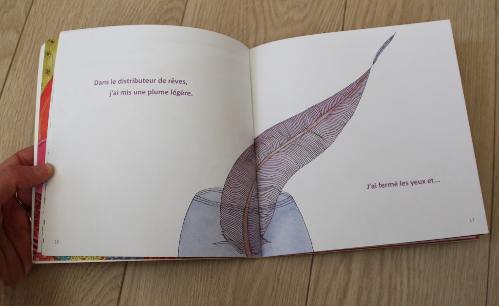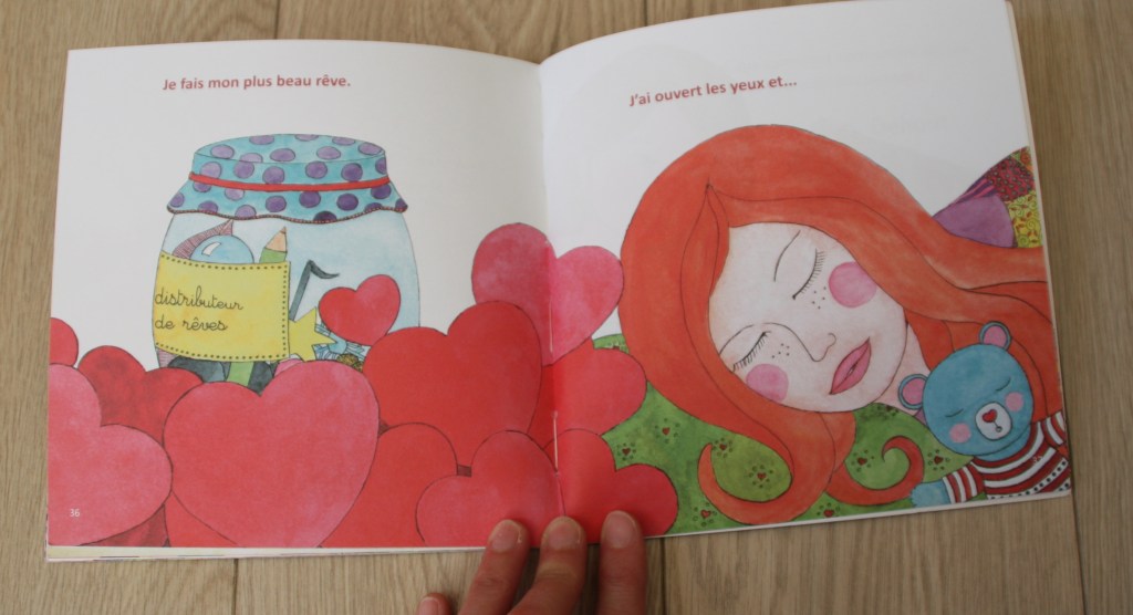Dans Le distributeur de rêves, Marie Tibi nous entraîne dans de jolis rêves d’une fille aux cheveux roux. Dans un pot appelé distributeur de rêves, une plume légère est ajoutée et la nuit nous entraine sur un nuage au dessus des oiseaux migrateurs en partance pour l’Afrique, un crayon de couleur y est mis et nous voilà sur un toboggan arc en ciel au milieu de bonbons, une bulle de savon colore et parfume la ville grise…