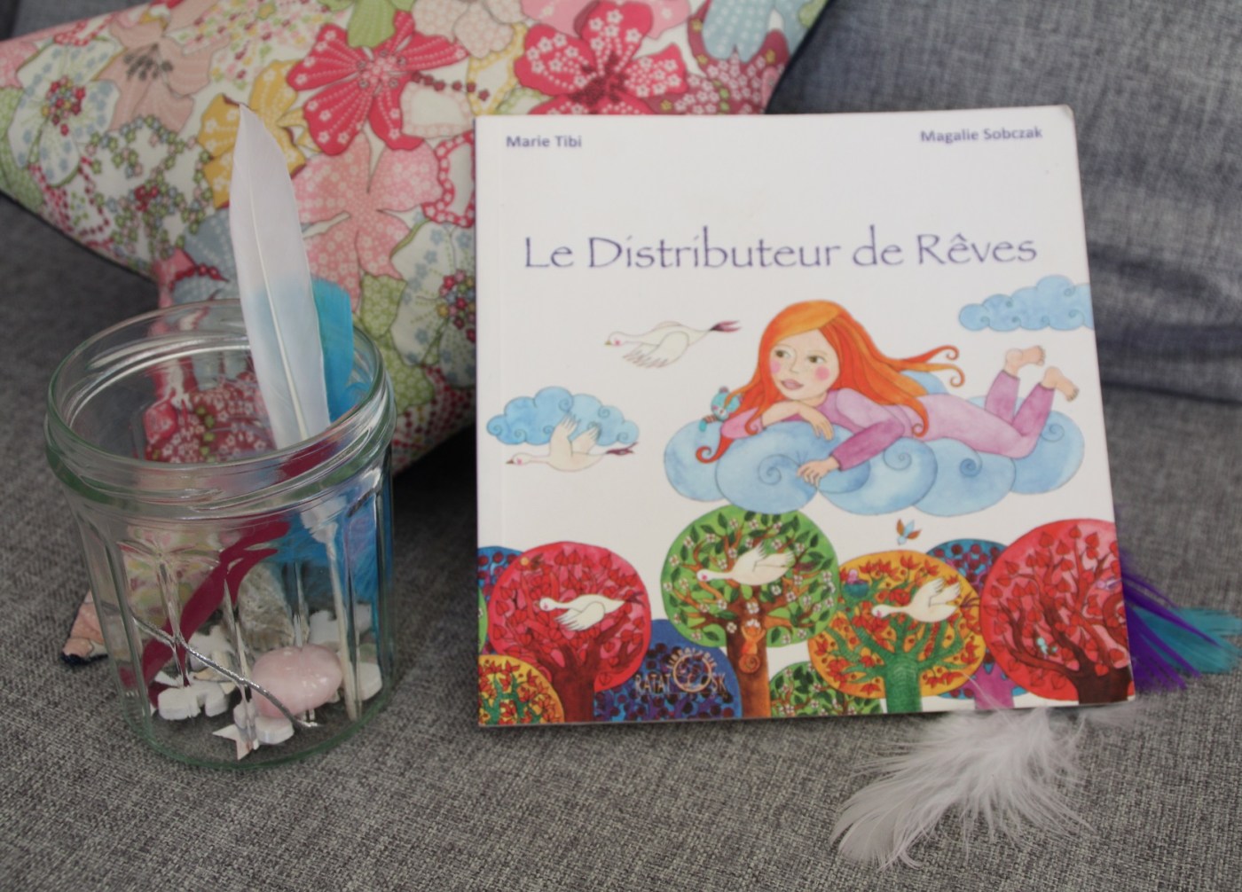 Dans Le distributeur de rêves, Marie Tibi nous entraîne dans de jolis rêves d’une fille aux cheveux roux. Dans un pot appelé distributeur de rêves, une plume légère est ajoutée et la nuit nous entraine sur un nuage au dessus des oiseaux migrateurs en partance pour l’Afrique, un crayon de couleur y est mis et nous voilà sur un toboggan arc en ciel au milieu de bonbons, une bulle de savon colore et parfume la ville grise…