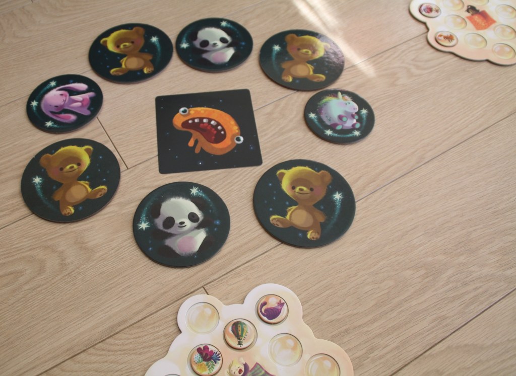 Et concrètement, c’est un jeu d’observation. On place plusieurs tuiles doudou autour d’une pile de carte cauchemar. On retourne une carte cauchemar représentant un ou plusieurs monstres et il faut sélectionner le doudou qui permettra de recouvrir complètement le ou les monstres. Attention, le nounours brun fonctionne à tous les coups, mais il permet de remporter un jeton rêve alors que la licorne plus petite en rapporte quatre. Et celui qui obtient douze jetons rêve gagne la partie. Il faut donc prendre des risques et bien estimer la taille de le taille doudou par rapport au monstre.