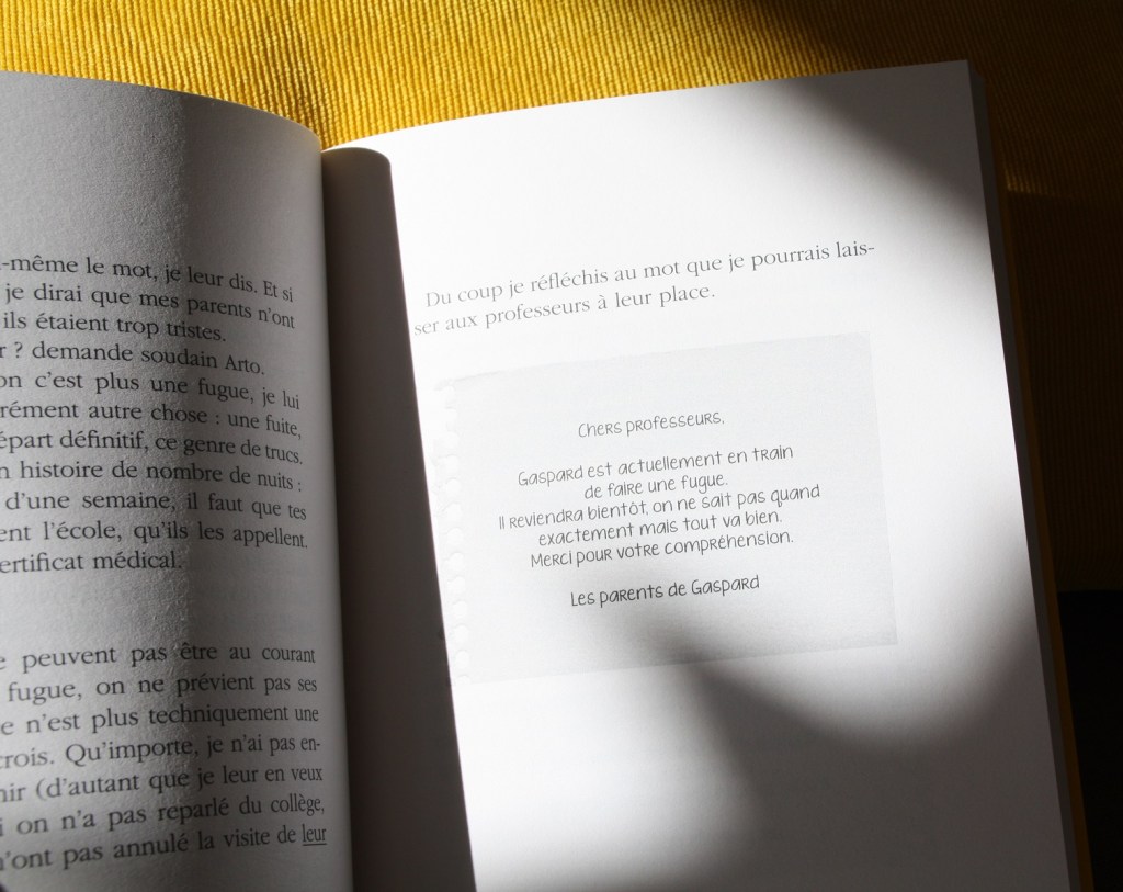 Les aventures de moi-même, journal de la fugue est un roman jeunesse (à partir de 9 ans) de Charly Delwart, illustré par Ronan Badel et publié chez Flammarion Jeunesse. Nous avons toutes les deux appréciées la lecture, ponctuée d’illustrations amusantes et de petits bouts de papier avec les liste de Gaspard.