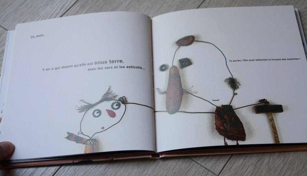 Comme toujours j’adore les illustrations de Christian Voltz qui sont un mélange de photographies réalisées avec du bric à brac et de dessins. Ca aide aussi à alléger ce thème de la mort, vous ne trouvez pas ?