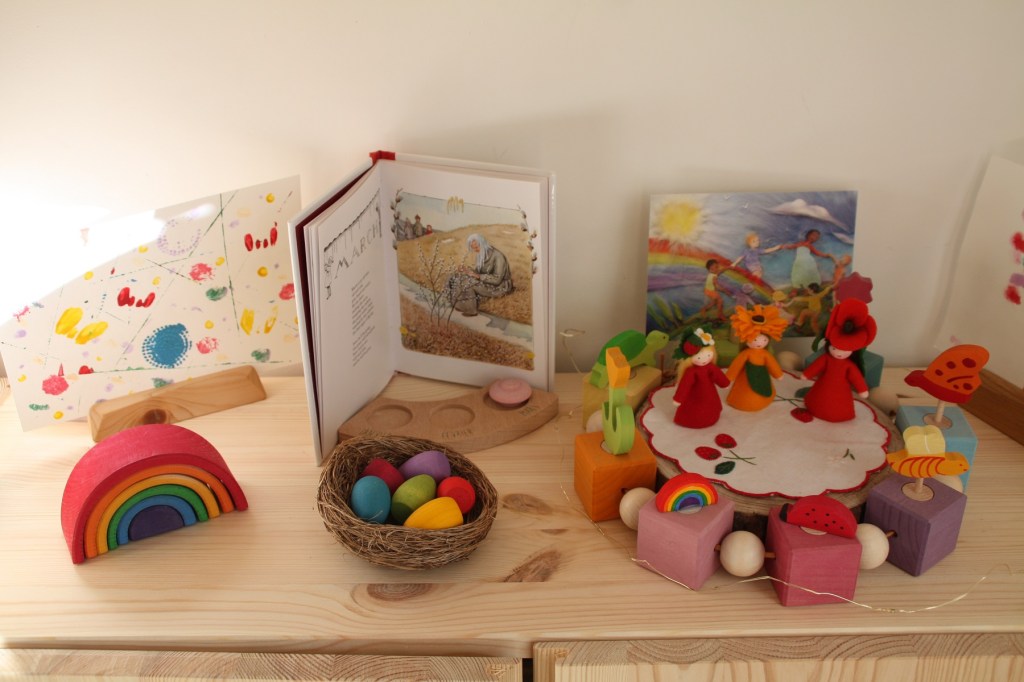 Notre table du printemps est souvent la plus colorée. Sur un meuble du salon, nous avons installé une couronne de célébration, des fées de la nature, un arc-en-ciel (pour chasser la grisaille ambiante) et quelques peintures des enfants.
