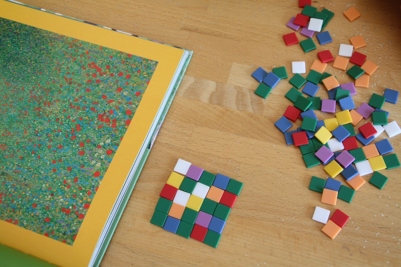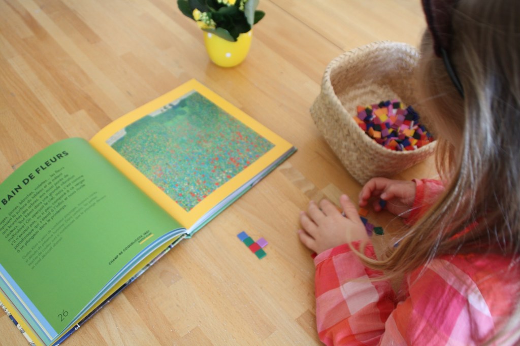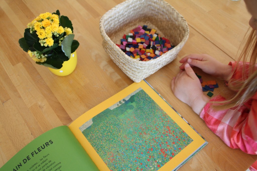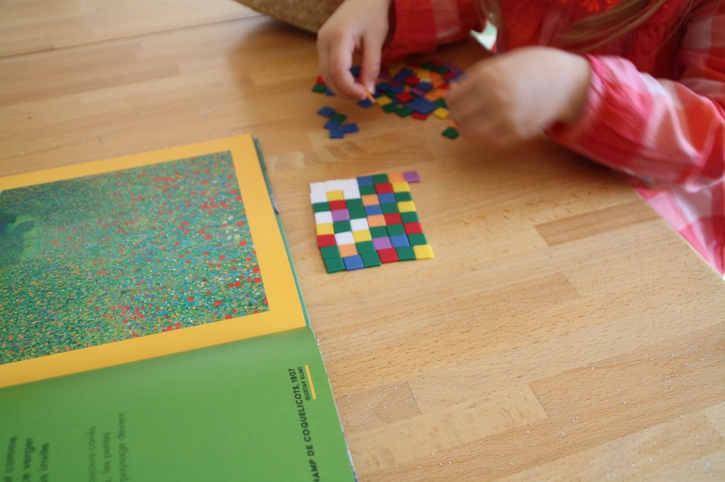 Après avoir regardé le livre Les saisons dans l’art présenté hier, nous nous sommes amusés à recréer le Champ de coquelicots de Gustav Klimt (tiré des œuvres représentant le printemps bien évidemment).
