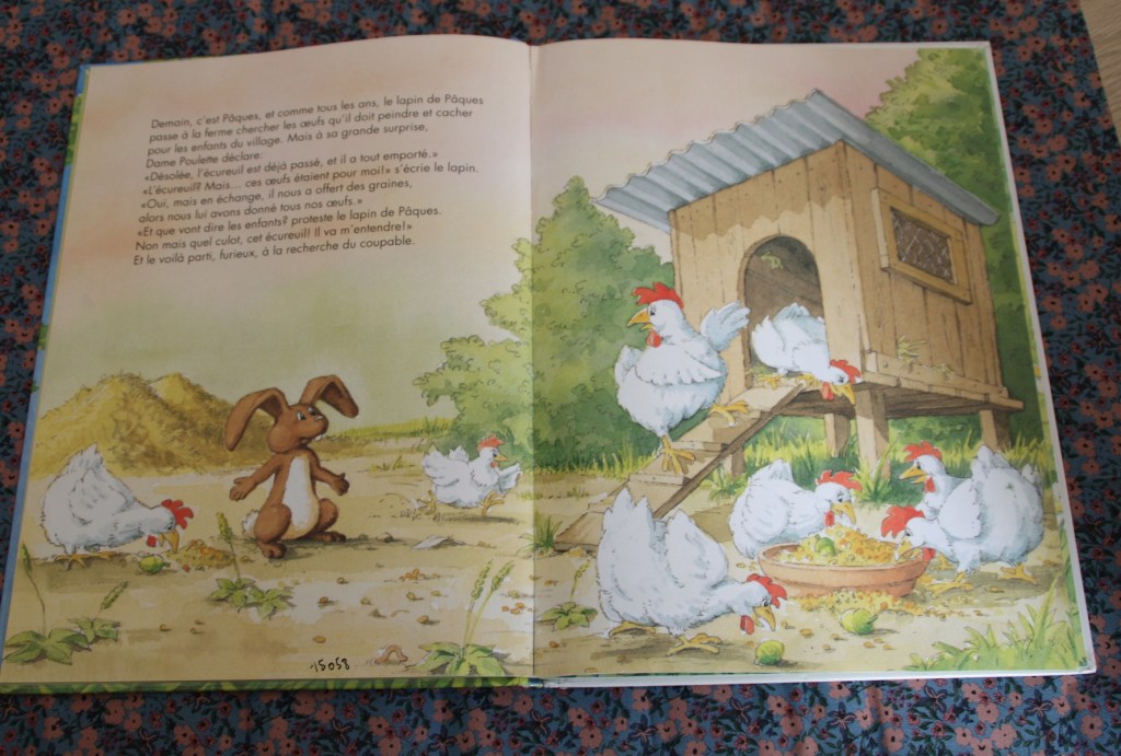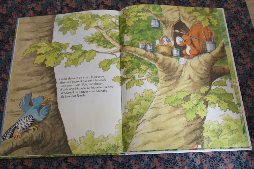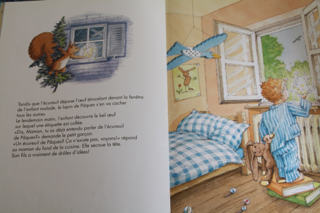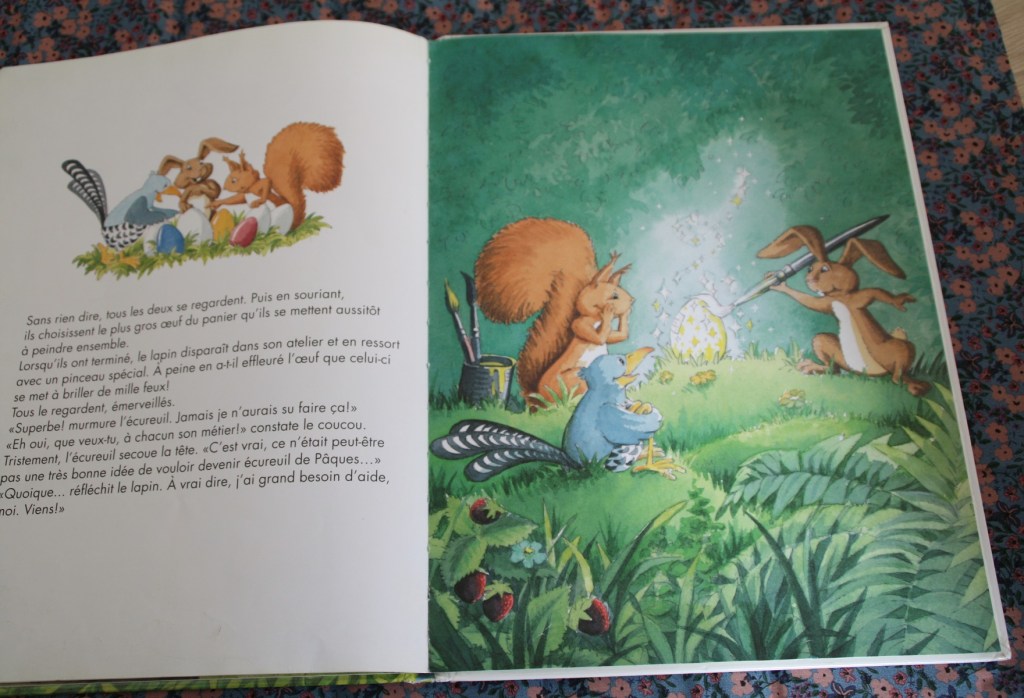 Quand le lapin de Pâques se rend au poulailler pour récupérer les œufs à décorer pour Pâques, quelle déconvenue ! L’écureuil est déjà passé pour les prendre en échange de grains. Après une petite dispute, finalement les deux amis décident de décorer et distribuer ensemble les œufs. Et surtout d’apporter directement son œuf à un enfant malade ne pouvant pas le rechercher dans son jardin.