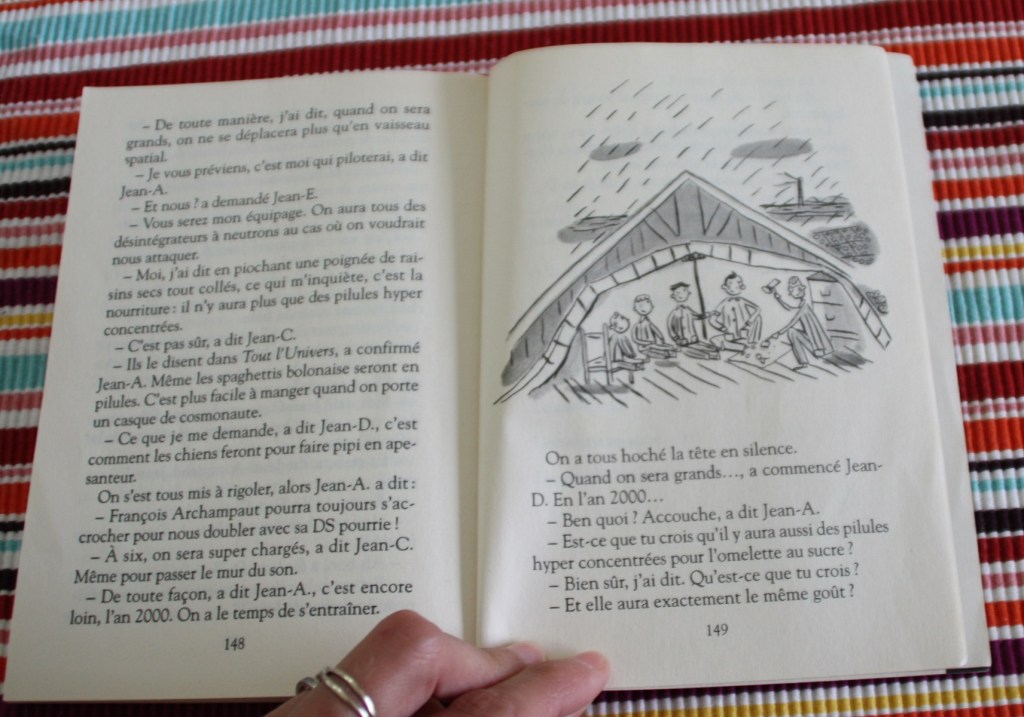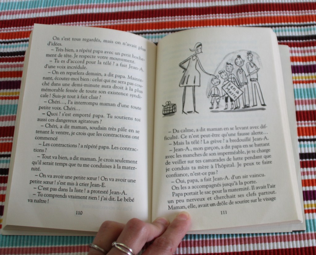 C’est l’histoire d’une famille avec cinq garçons se prénommant Jean-A, Jean-B, Jean-C, Jean-D et Jean-E. Je pense qu’il y a une part d’autobiographie là-dedans car l’auteur s’appelle Jean-Philippe et il dédie ce livre à J-P, J-F, J-N… C’est leur quotidien, avec quelques péripéties et beaucoup de moments amusants : l’école, les vacances, la colo, les animaux de compagnie, les jeux et les bagarres entre frères… Et l’histoire commence par l’annonce de l’arrivée d’un sixième enfant. Je vous laisse deviner le sexe et le prénom de ce bébé. C’est aussi une autre époque avec une éducation différente : une plus grande liberté des enfants mais des claques qui fusent.