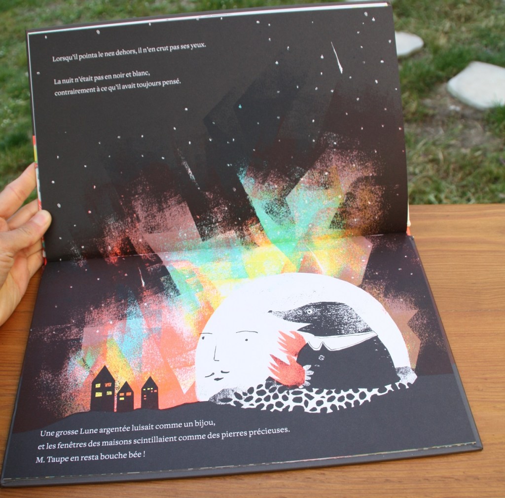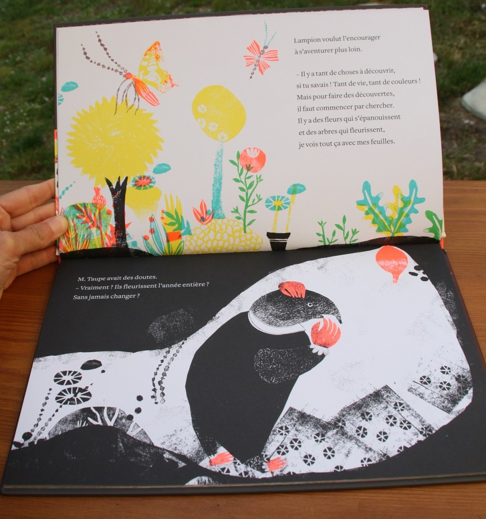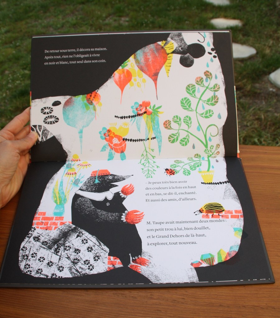 Effectivement quand on découvre monsieur Taupe, il vit dans son terrier, un trou très sombre et aussi humide. La seule touche de couleur est apportée par un lampion rose, son ami. Mais monsieur Taupe se sent bien dans son trou, en sécurité. Pourtant, il s’interroge : qu’il y a t-il au dessus ? Il hésite et lampion l’encourage. Il y a tant à découvrir. Sur terre, c’est une explosion de couleurs avec les plantes, les oiseaux, les maisons… Mais la nuit, c’est forcément noir se dit la taupe. Il va avoir l’occasion de le découvrir car son cher ami le lampion, qui est en fait un radis, est cueilli. Monsieur Taupe est très triste mais décide de suivre ses conseils et de découvrir le monde. Que c’est beau et pas seulement les couleurs, mais aussi les parfums, les sons… La taupe aime tellement cela qu’elle cueille de quoi décorer sa maison sous terre.