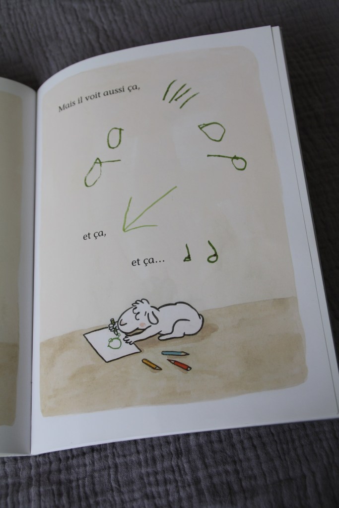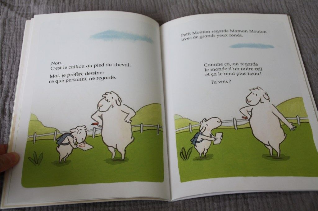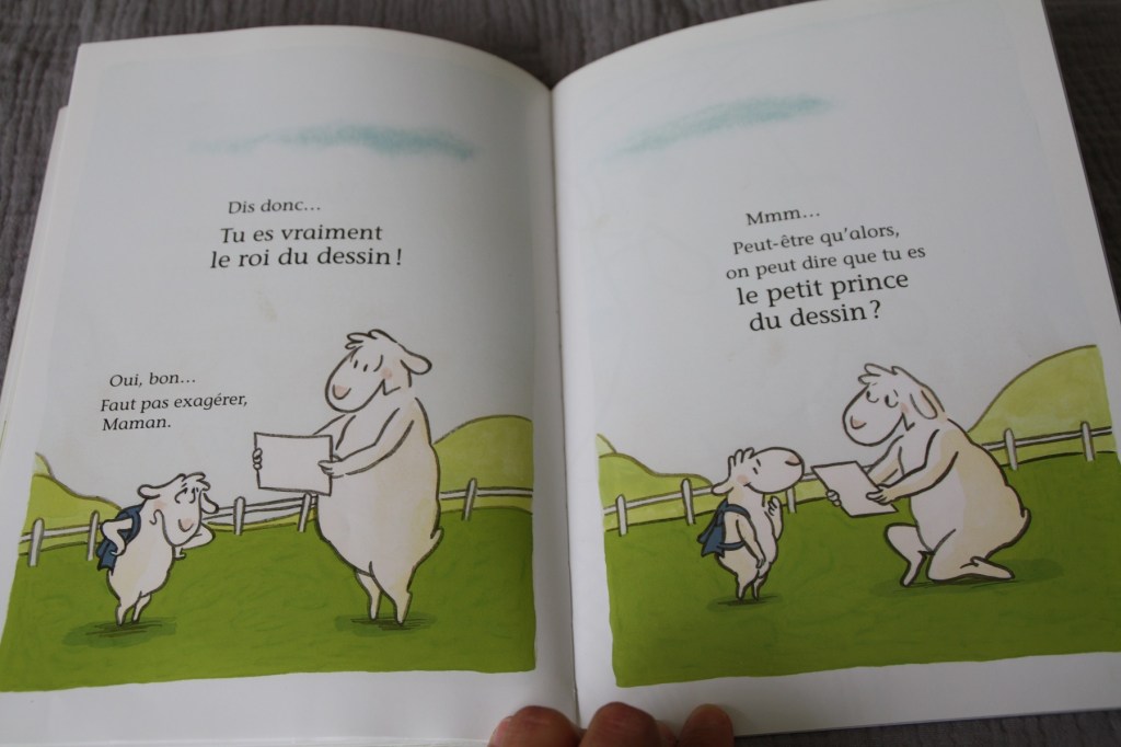 Et tiens en parlant de moutons, voici justement une histoire qui commence dans une école de moutons. L’un des moutons s’amuse à dessiner un petit prince. Tous les autres enfants trouvent cela magnifique et décident de l’imiter. Tous, sauf un petit mouton qui trouve qu’il ne sait pas dessiner. Le soir, il en parle à sa maman et lui demande de lui dessiner un cheval. La maman décide de dessiner ce que personne ne regarde, soit le caillou au pied du cheval (c’est plus facile qu’une bête à quatre pattes, hein… maline la maman). Le lendemain, le petit mouton raconte cela à ses copains et tous trouvent cela génial. Ils se mettent de reproduire les pieds de la table, la toile d’araignée au plafond… Petit mouton, lui, a toujours l’impression que ses dessins ressemblent à des gribouillis. Mais ses copains de classe sont impressionnés car il a réussi à reproduire ce qu’il y avait dans sa tête. Et ça c’est trop fort !