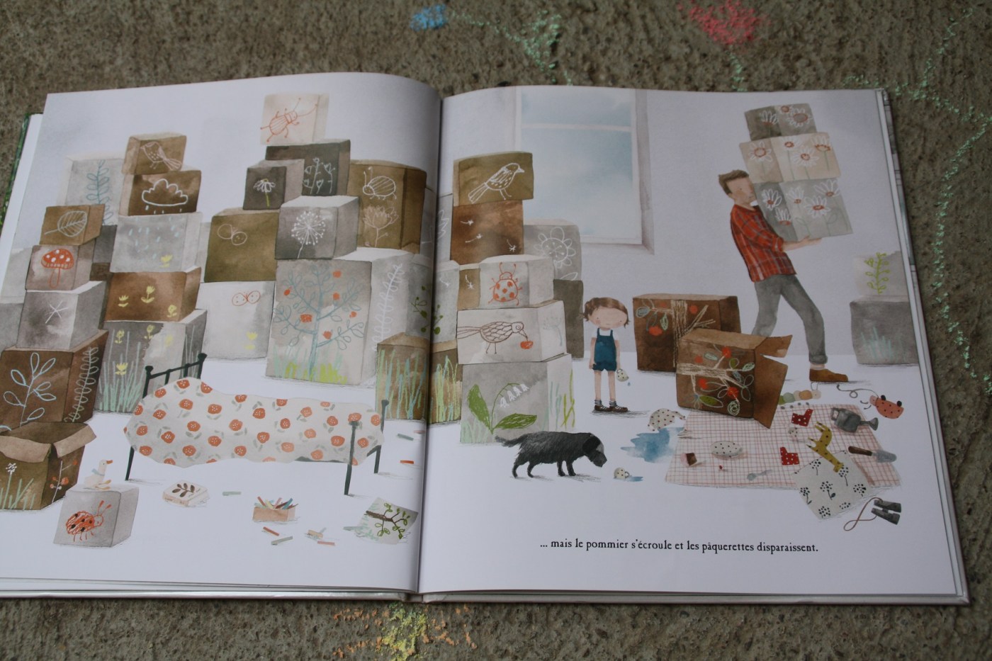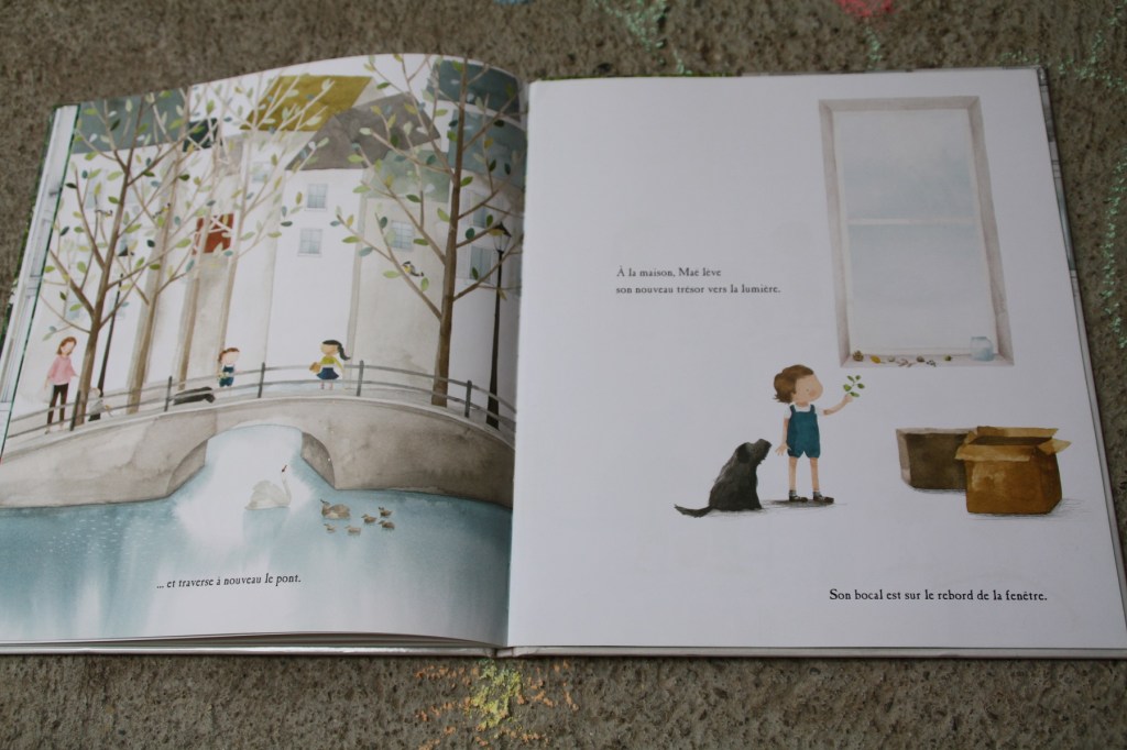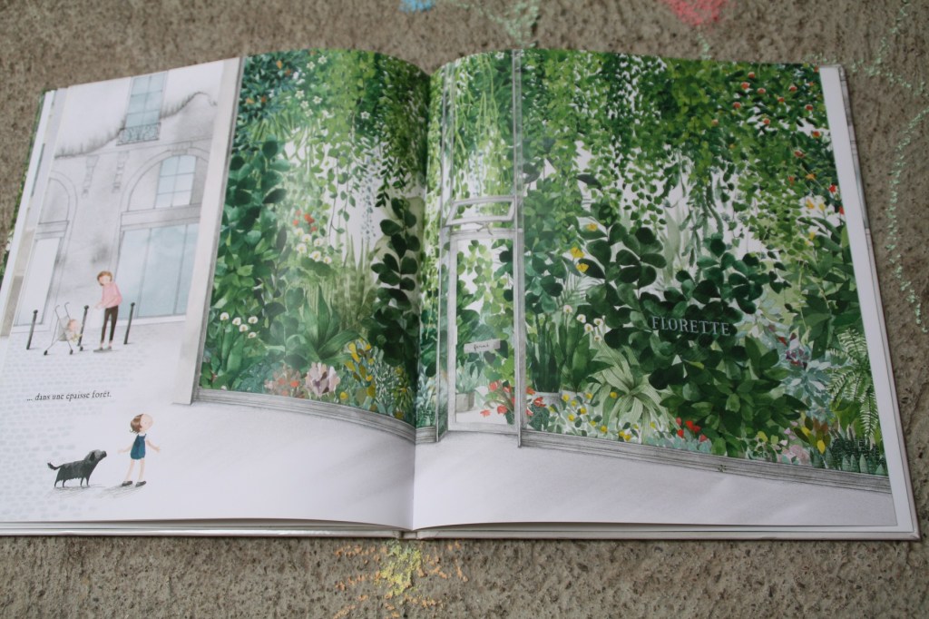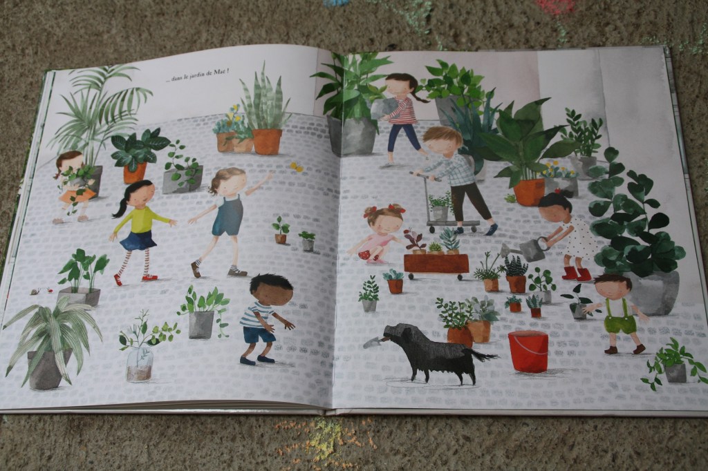 Elle tente d’égayer son appartement en dessinant la flore et la faune sur les cartons de déménagement et dans la cour. Mais les cartons sont défaits et les dessins effacés. Elle décide d’entrainer sa mère vers ce qu’elle pense être un parc. Malheureusement, peu de verdure autour des jeux pour enfants. En rentrant, elle tombe sur une véritable forêt. Elle est devant la vitrine de la fleuriste Florette. La boutique est fermée, mais une petite plante pousse juste là, sur le trottoir. Maé va la ramener à son immeuble. Et de pousses de pousses, la fillette va recréer un jardin dans la cour, avec l’aide des autres enfants du quartier.