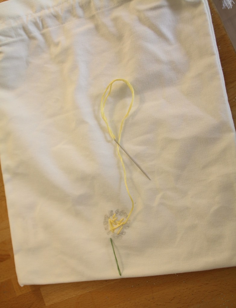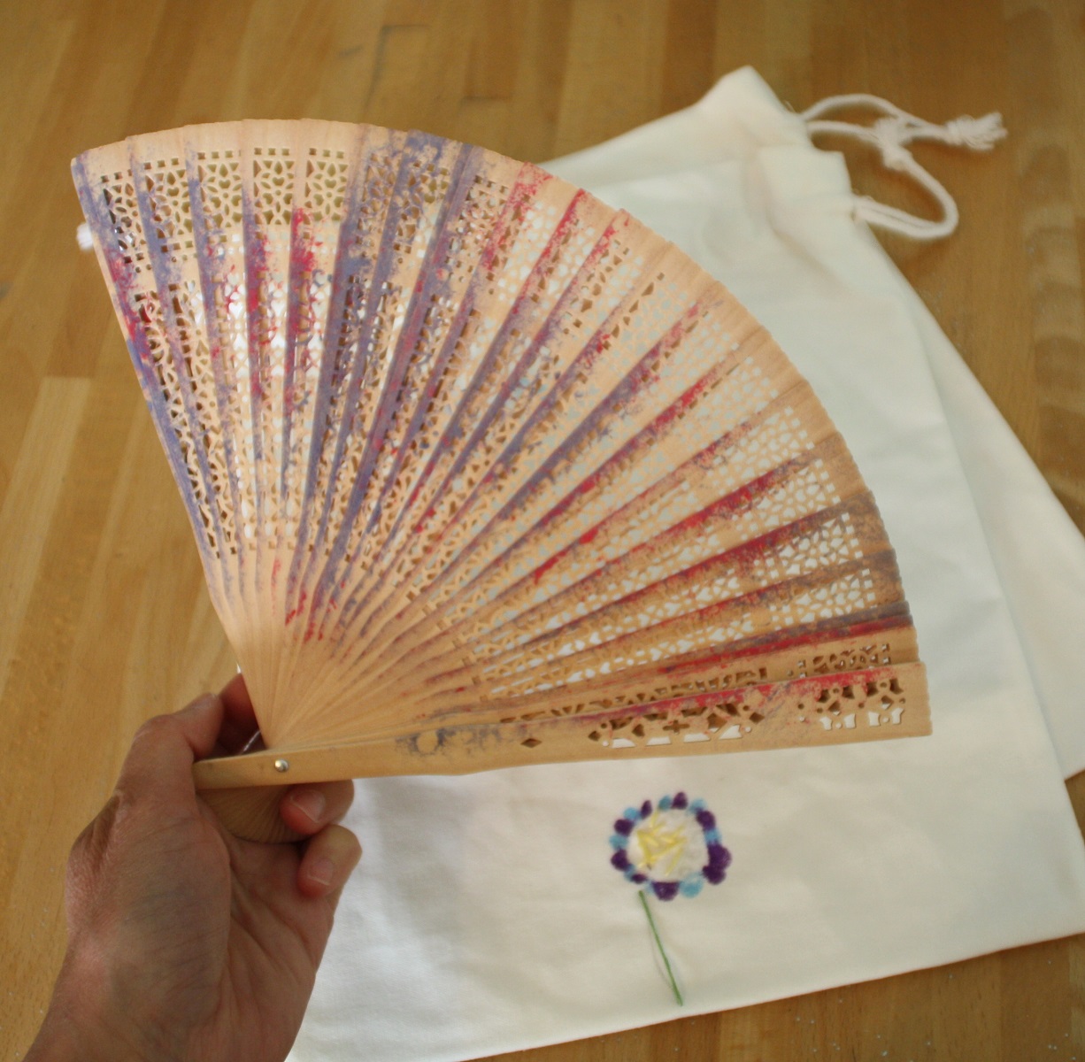 Les éventails en bois ont été décorés par la cadette, avec deux couleurs de peinture appliquées à l’éponge. J’ai trouvé des gourdes en verre avec une protection en silicone. Et plutôt que du papier ou un sac jetable pour emballer le tout, nous avons utilisé un pochon en tissu qui pourra leur servir à ranger chaussures ou sous-vêtements dans leur valise. J’ai proposé à ma fille de décorer les sacs, soit au feutre pour tissu, soit avec une petite broderie. Elle a opté pour les deux en personnalisant les pochons avec leur prénom et en brodant un soleil sur l’un et une fleur sur l’autre.