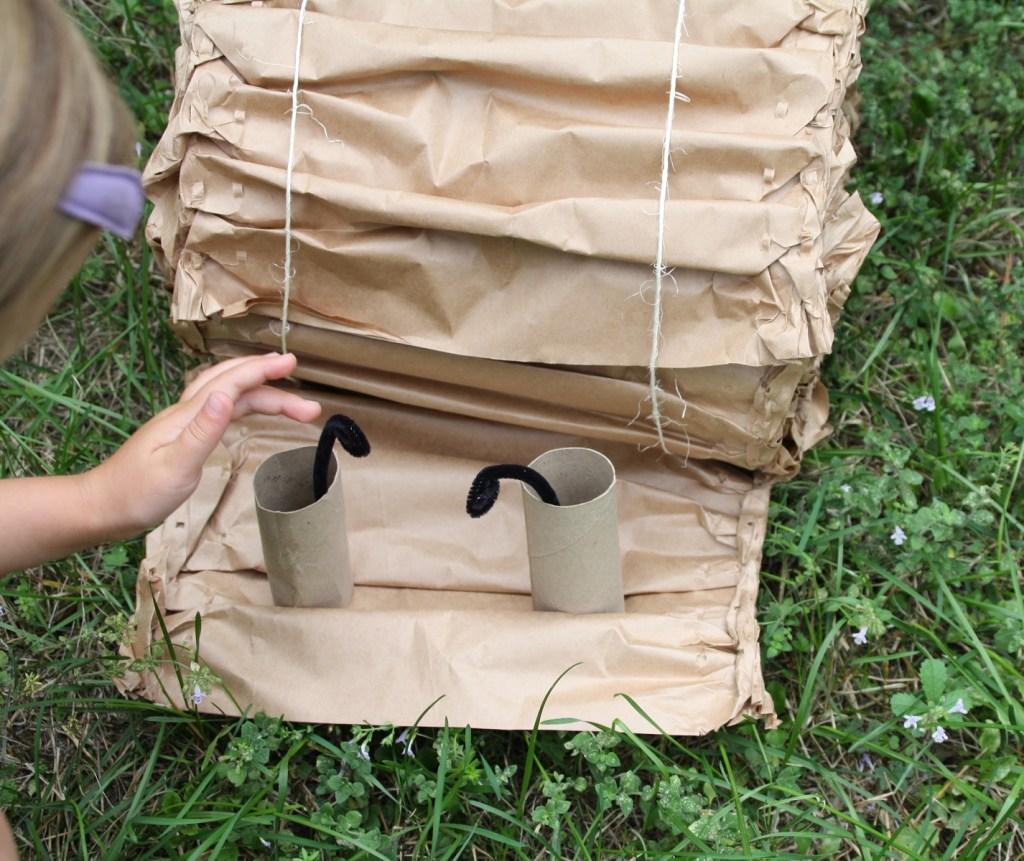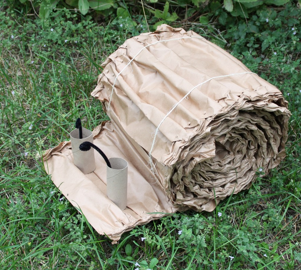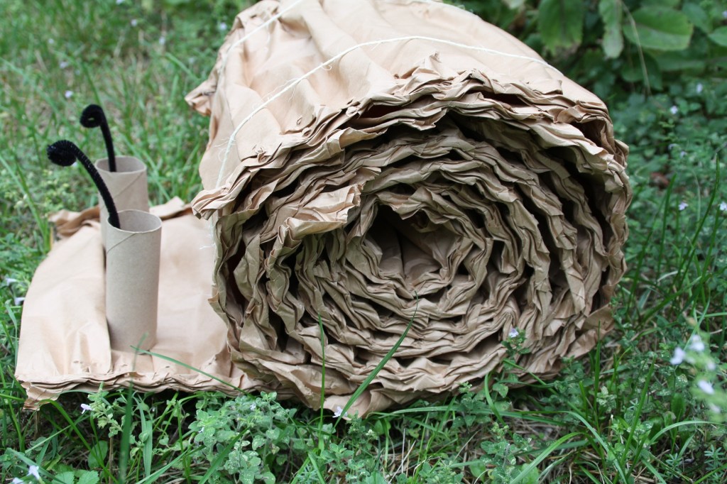 C’est l’escargot que j’ai bricolé avec des éléments de calage de colis en papier kraft (pour faire la coquille), deux morceaux de ficelle pour les maintenir enroulés, deux tubes en carton et deux morceaux de fils chenille pour les antennes.
