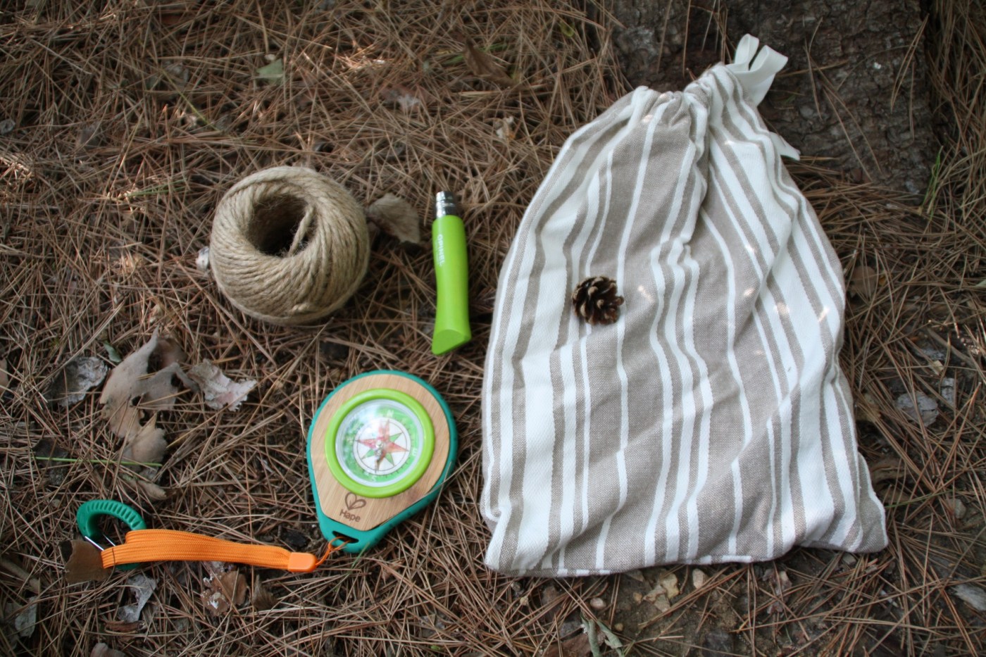 J’y ai ajouté la loupe (que nous utilisions plutôt dans le jardin), un petit couteau (à bout rond) pour couper la ficelle ou tailler des bouts de bois et un petit cahier. Voilà, nous avons de quoi nous orienter dans la pinède, observer la nature, identifier les traces d’animaux, dessiner le paysage ou prendre des notes, construire une cabane… la liste n’est pas exhaustive.