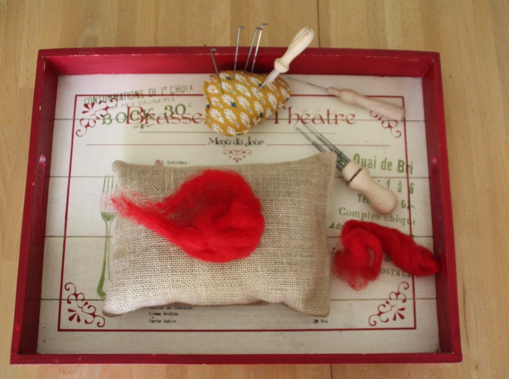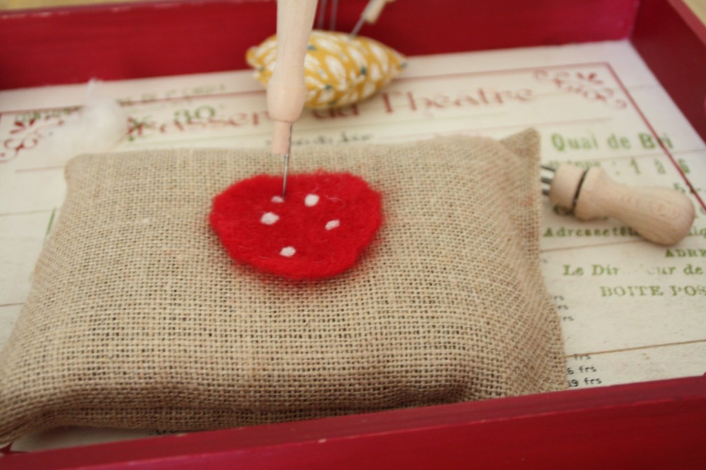J’ai ressorti la laine cardée et les aiguilles à feutrer. J’ai testé un nouveau support sur lequel sont fixées 6 aiguilles. C’est très pratique pour les grandes surfaces car ça permet un feutrage uniforme et plus rapide. Ce n’est pas que mon champignon était particulièrement grand, mais ça m’a évité de me piquer les doigts 😉 Je n’ai pas utilisé d’emporte-pièce cette fois-ci pour délimiter la forme. Par contre, j’ai redécoupé le chapeau du champignon aux ciseaux, une fois le feutrage terminé.