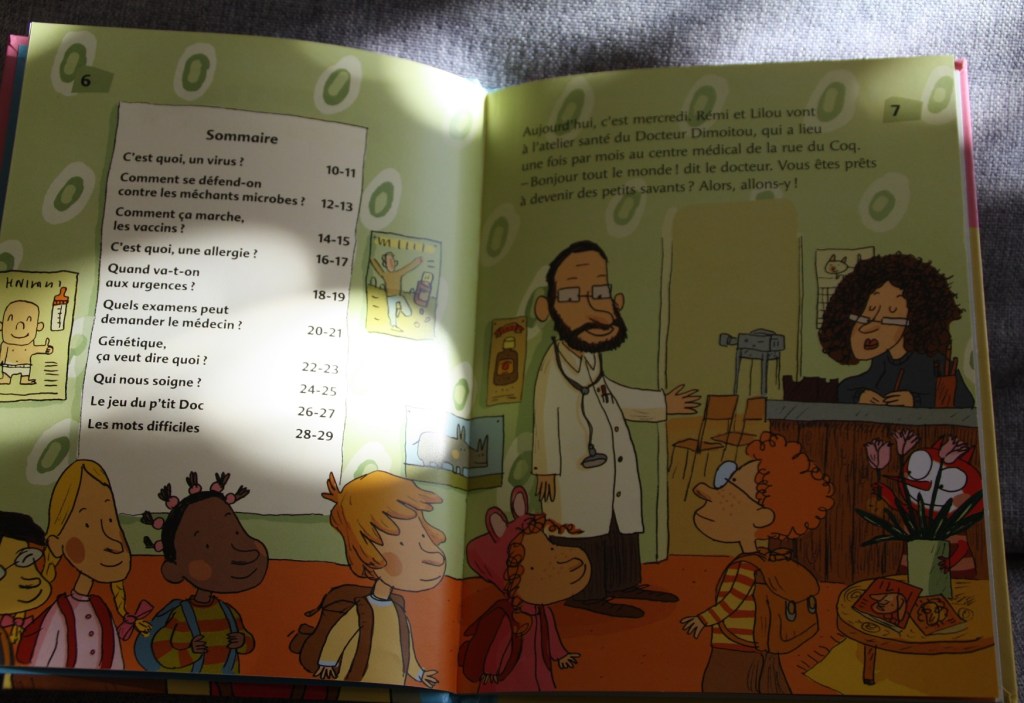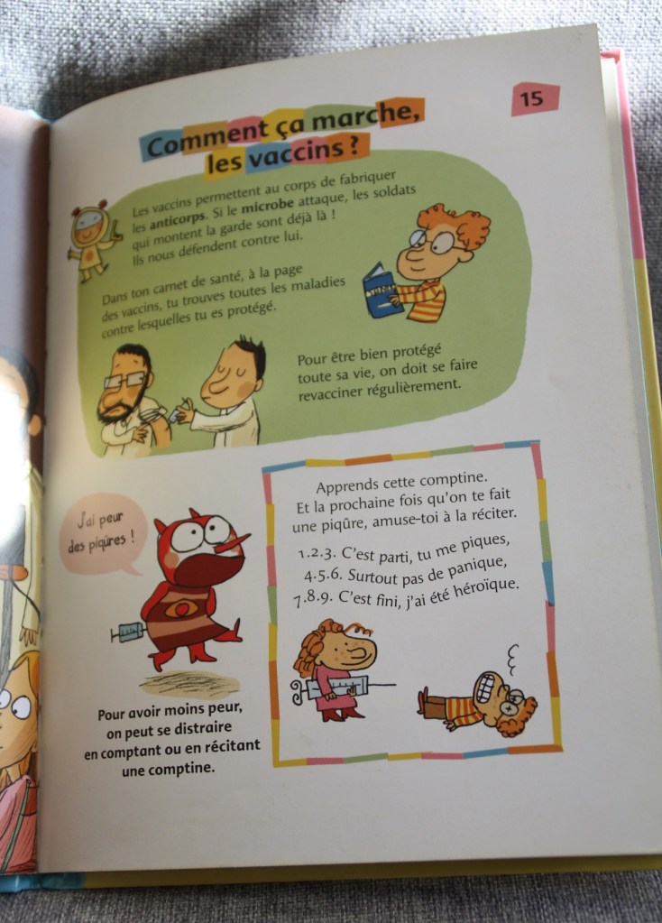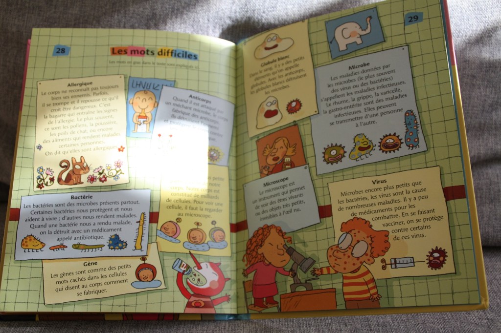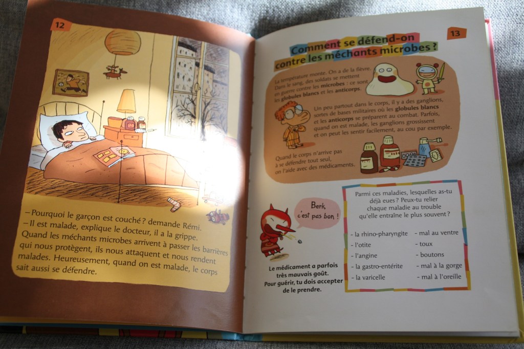 Le second est un documentaire qui parle de la santé en général. Un médecin répond aux questions des enfants sur les maladies, les virus, les vaccins, la génétique, les allergies… A côté des explications, adaptées aux enfants d’école maternelle, il y a un petit monstre très amusant et des jeux sous forme de devinettes ou charade. Dommage que cette collection En grande forme ne soit plus éditée, je la trouve bien faite ; mais on trouve encore ces livres d’occasion 😉
