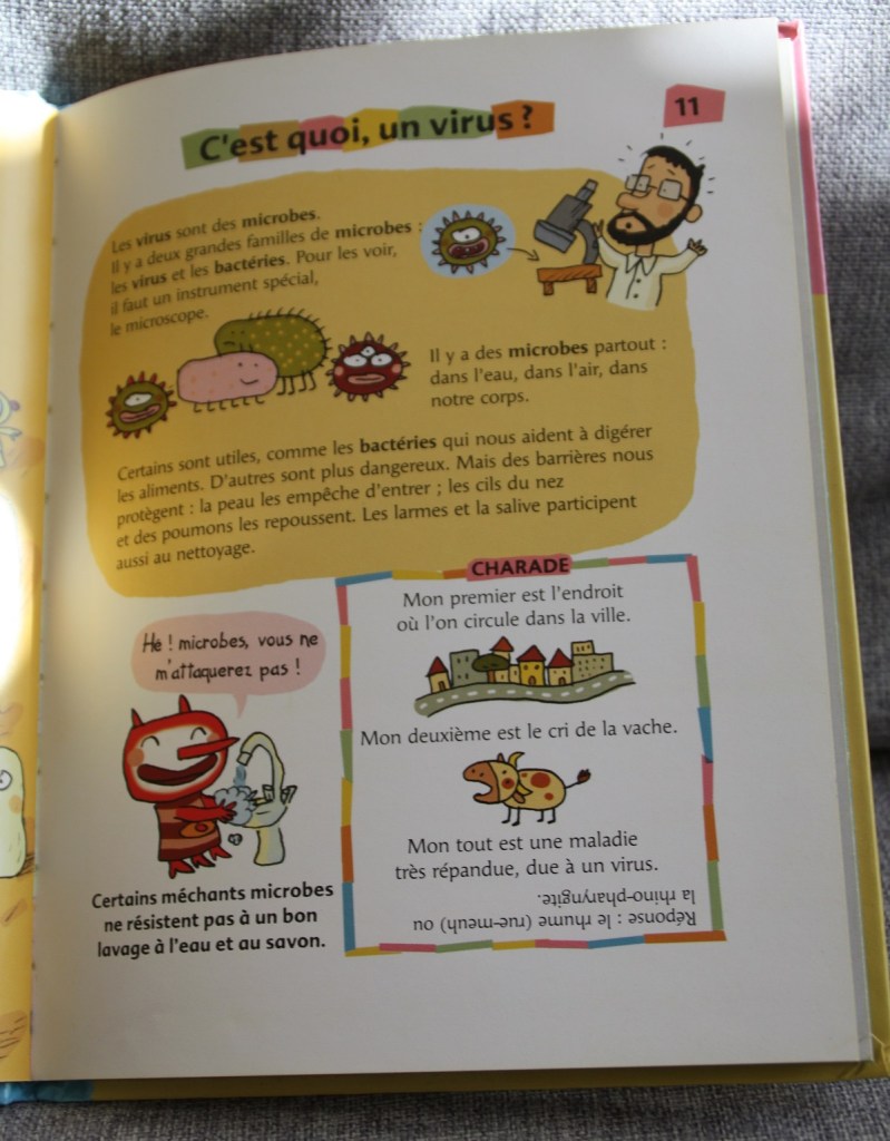 Tandis que je révise les lettres grecques, les enfants deviennent (malheureusement) experts en gestes barrières, catégories de masque, lieux nécessitant un pass sanitaire… Même si on essaie de les préserver. Au fait, c’est quoi un virus ? Voici donc deux livres qui parlent de virus, entre autres.