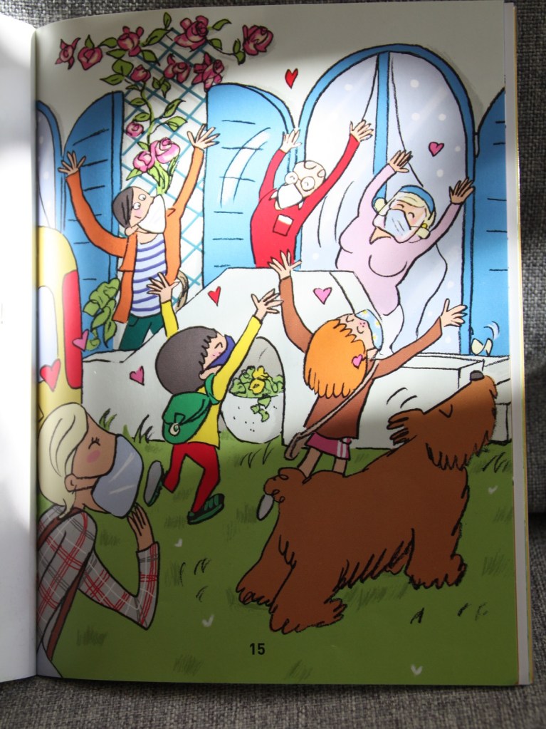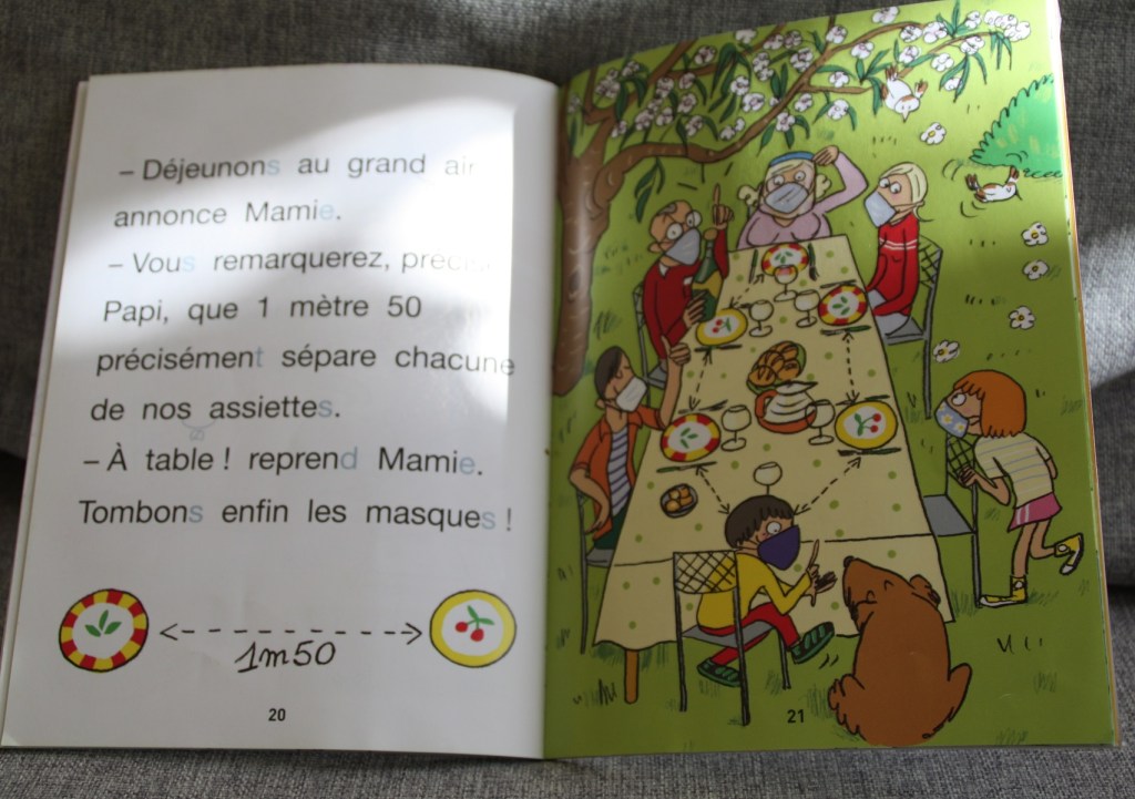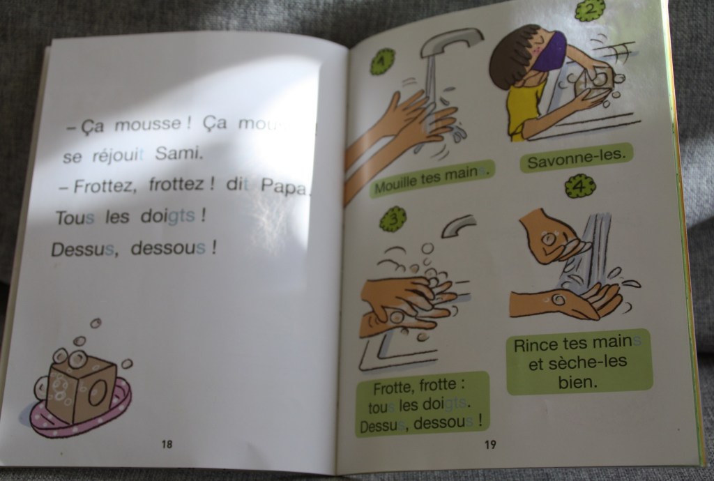 Le premier a été publié pendant le deuxième confinement. C’est l’histoire de Sami et Julie qui voient enfin leurs grands-parents après des semaines de restriction. Cela parle masque, distanciation, gel hydroalcoolique… La cadette l’a choisi et emprunté à la bibliothèque. Je n’avais pas forcément envie d’entendre ce nous vivons depuis de nombreux mois. Elle, elle y a vu un livre qu’elle pouvait lire toute seule. Bon point pour l’illustration expliquant comment bien se laver les mains.