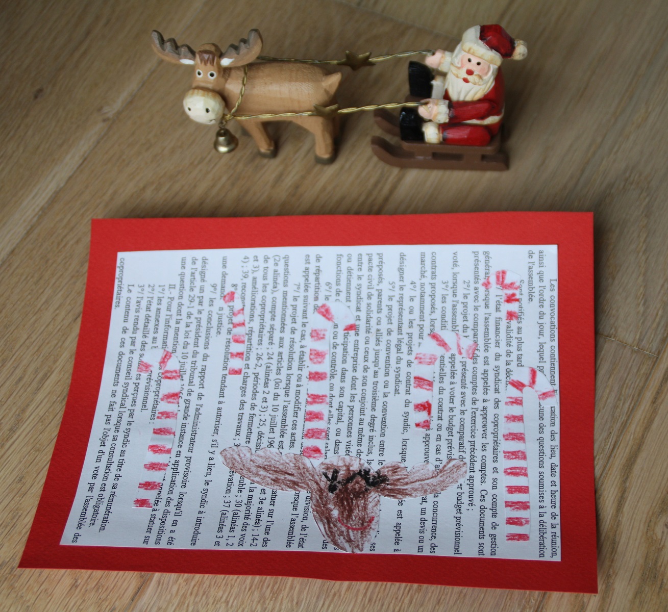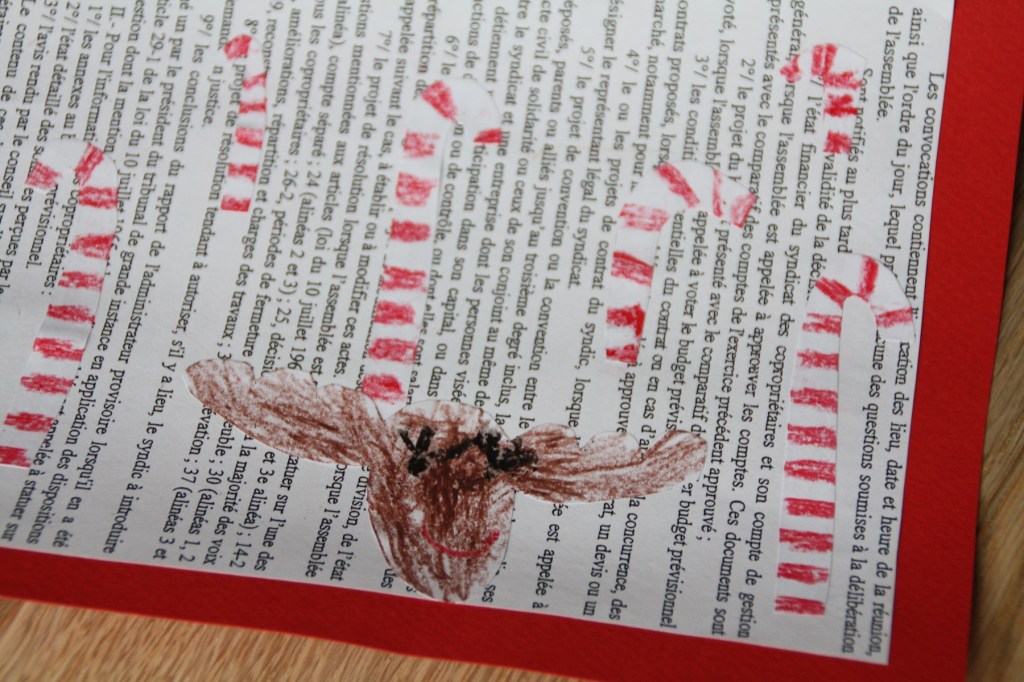 Récupération d’une feuille imprimé, dessin, découpage, coloriage aux crayons gras et collage. Voici une co-création pour décorer nos murs à Noël : une forêt magique avec ses arbres sucre d’orge et son renne souriant.