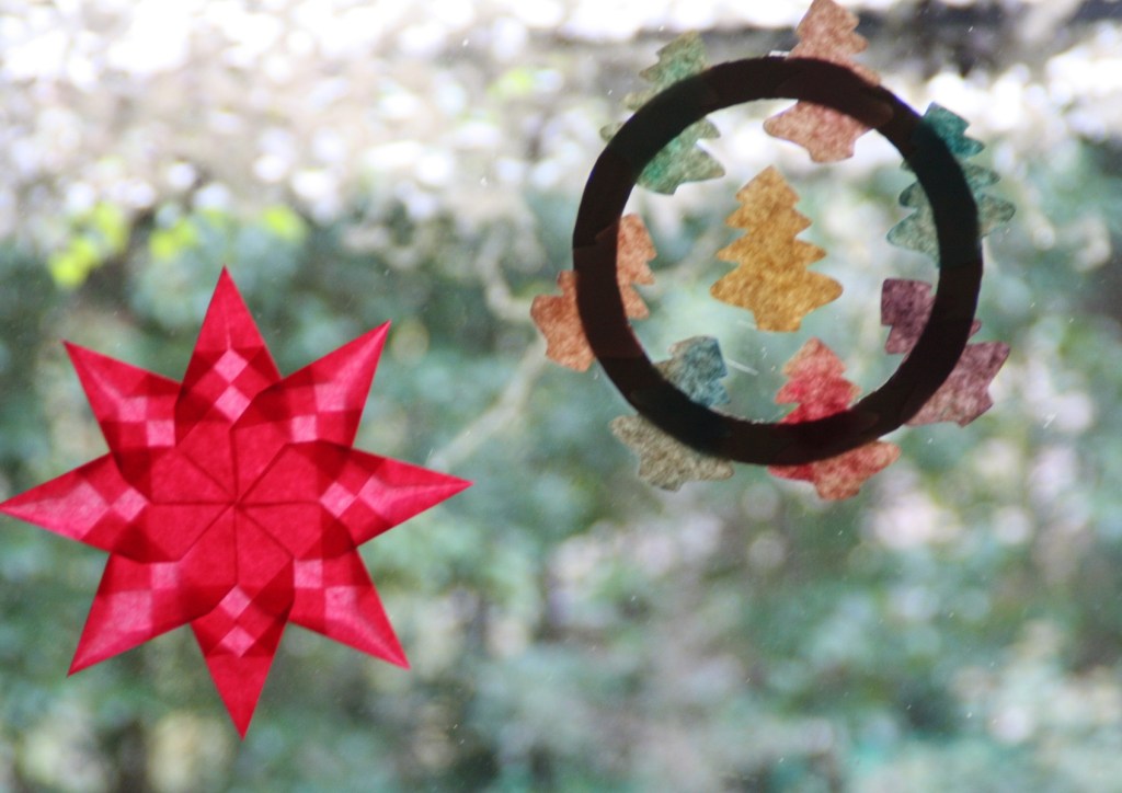 J’ai fixé les sapins mulicolores sur une couronne de carton. Et voici une décoration pour nos fenêtres.