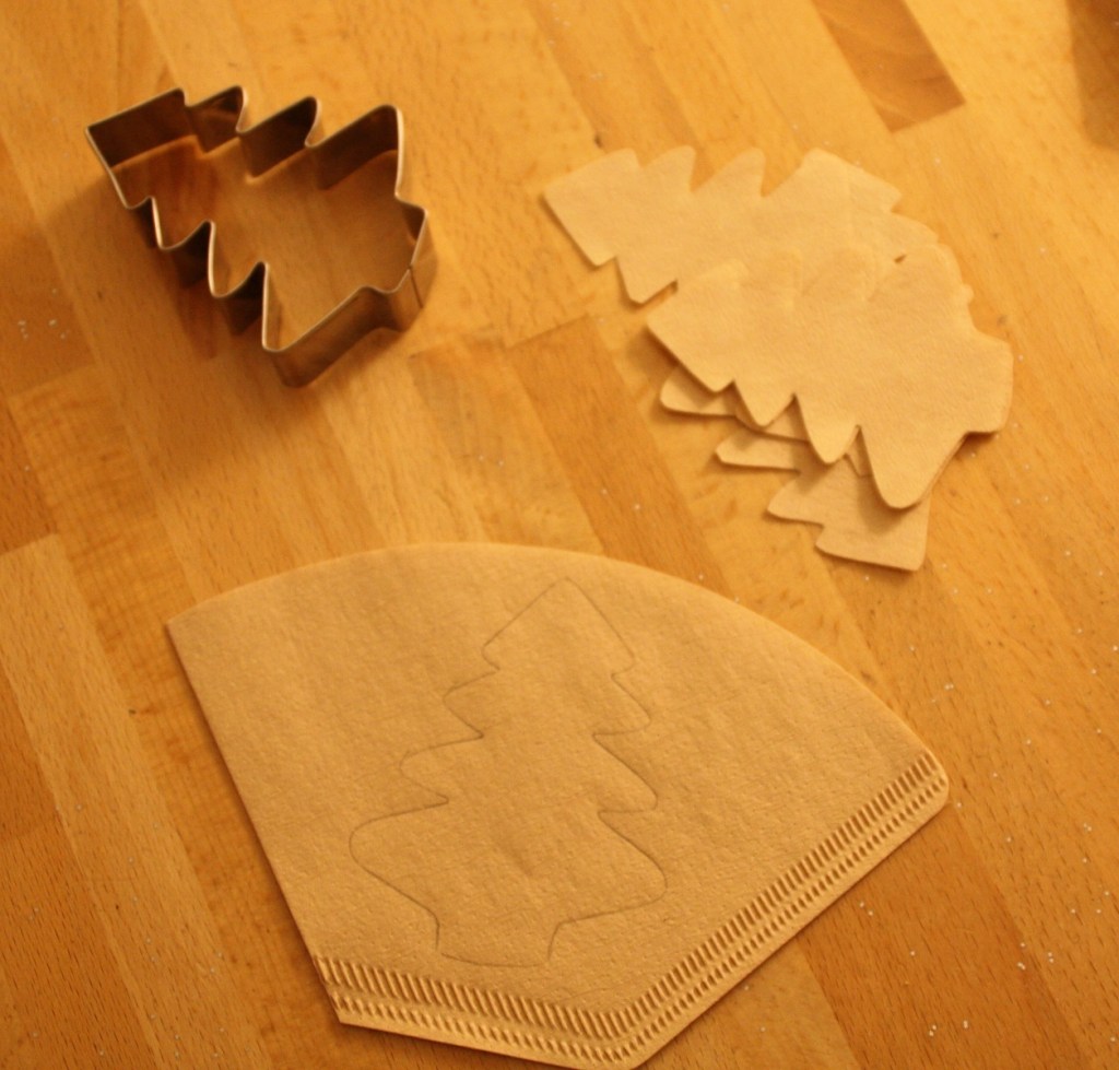 J’ai utilisé un emporte-pièce pour dessiner des silhouettes de sapins sur des filtres à café.