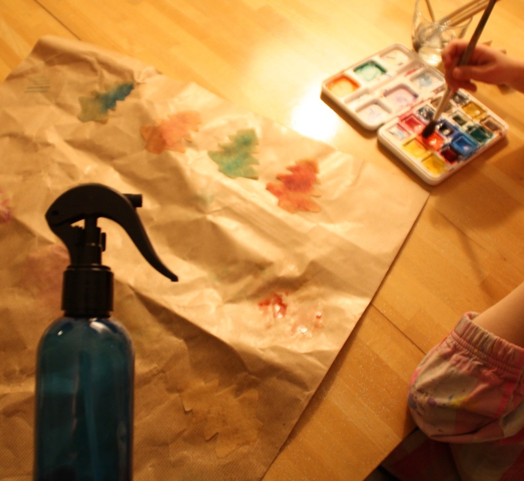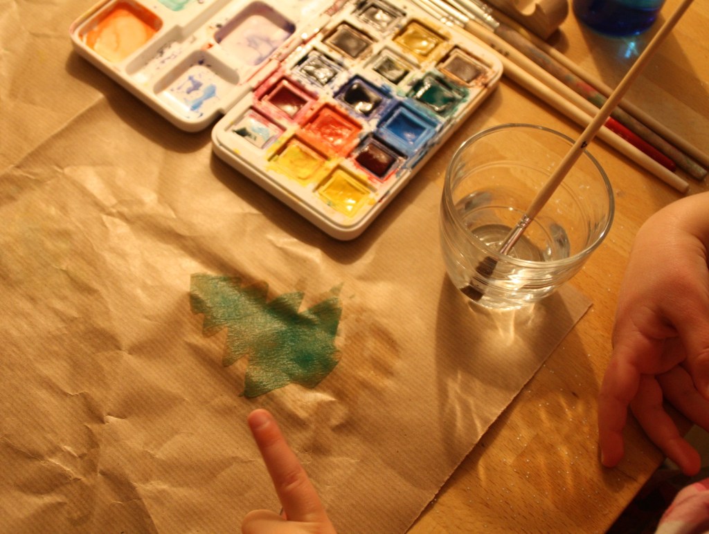 Après découpage, la cadette les a peints à l’aquarelle, avec la technique mouillé sur mouillé. C’est-à-dire qu’elle a vaporisé un peu d’eau sur le papier filtre avant de peindre, afin que la couleur soit plus fondue et transparente.