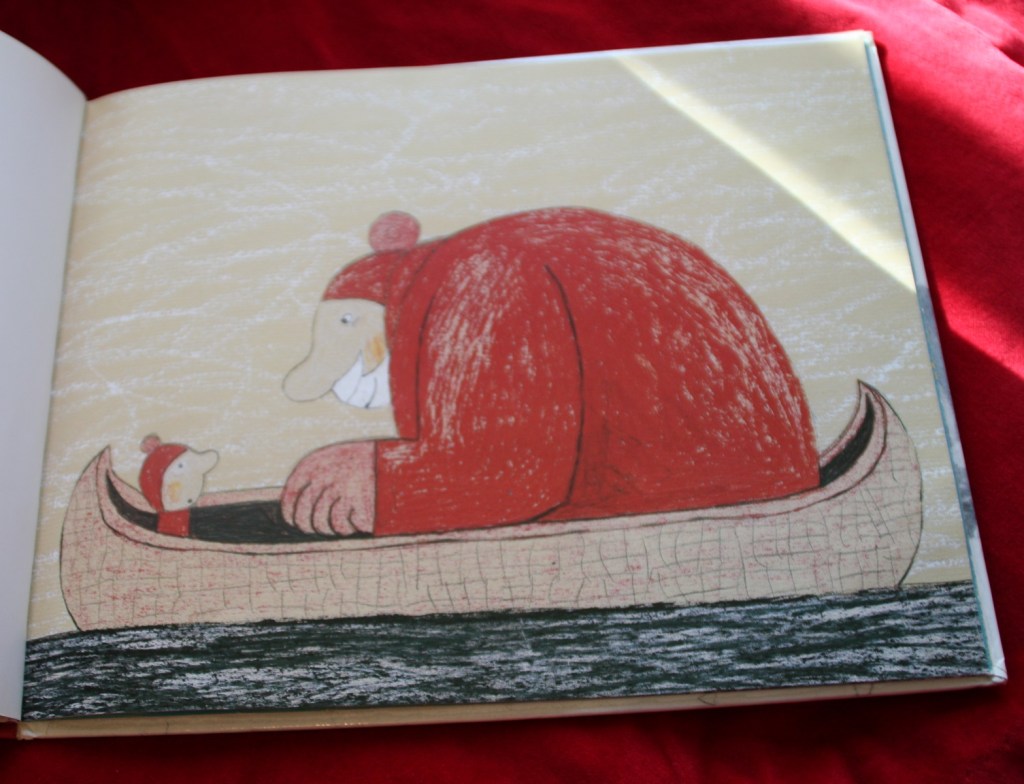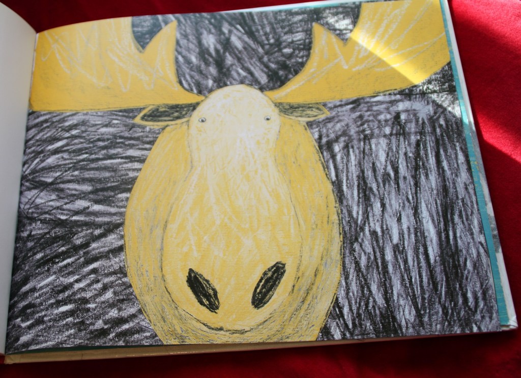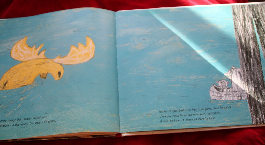 Voici une jolie trouvaille faite à la bibliothèque. C’est la nuit de Noël et un grand-père canadien (qui a un petit air du Père Noël !) emmène son petit-fils faire un tour de canoé au milieu d’une forêt. Ils vont pouvoir y observer un majestueux orignal. Une nuit dont le petit garçon se souviendra longtemps.