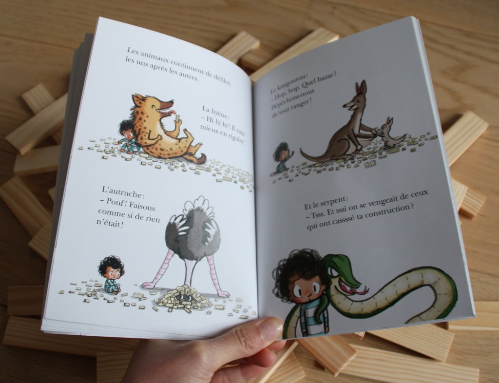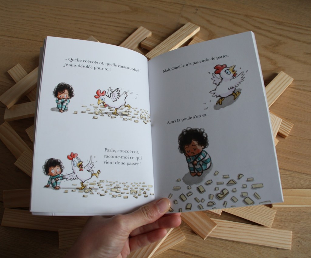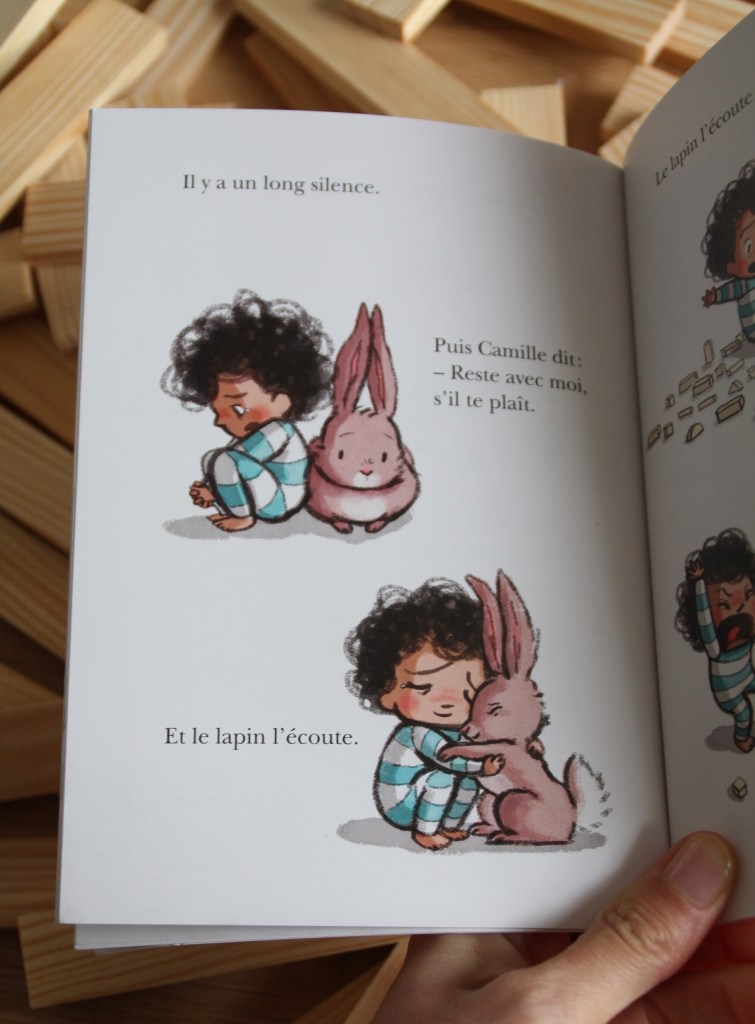 C’est une jolie histoire sur les émotions. La situation de Camille et sa mésaventure avec sa construction parlera à tous les jeunes enfants. Combien ont empilé patiemment des dizaines de blocs de bois mais ont vu leur création s’écrouler. La frustration, la colère mais aussi la tristresse sont les premières émotions de Camille et l’intervention des animaux n’y changera rien. Quand le lapin va faire peuvre d’empathie et écouter Camille avec bienveillance.