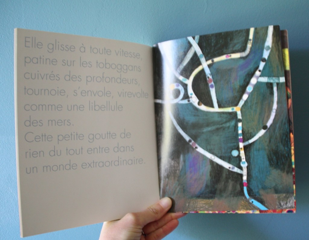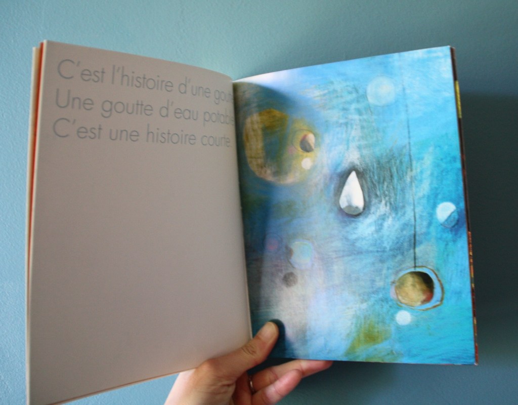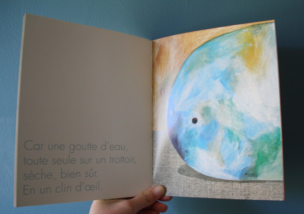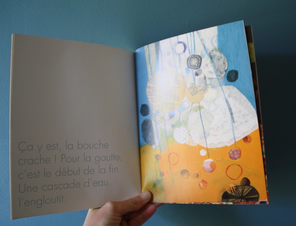 De la couleurs, une multitudes de ronds et un mélange de technique dont du collage. L’histoire elle est comme son titre l’indique, l’histoire courte d’une goutte d’eau dans coule dans un lavabo tandis qu’une personne se brosse les dents, se retouve dans les canalisations et termine sur un trottoir où elle sèche au soleil. Une histoire courte pour une vie courte.
