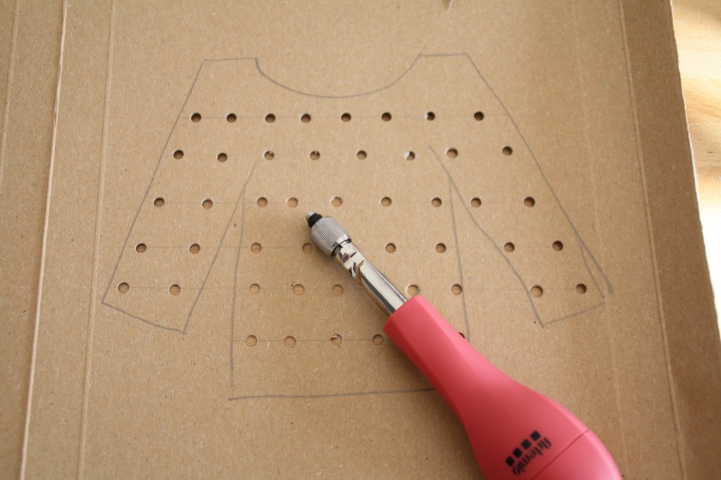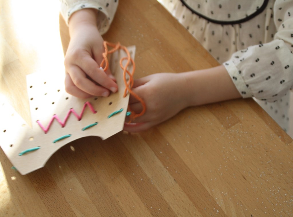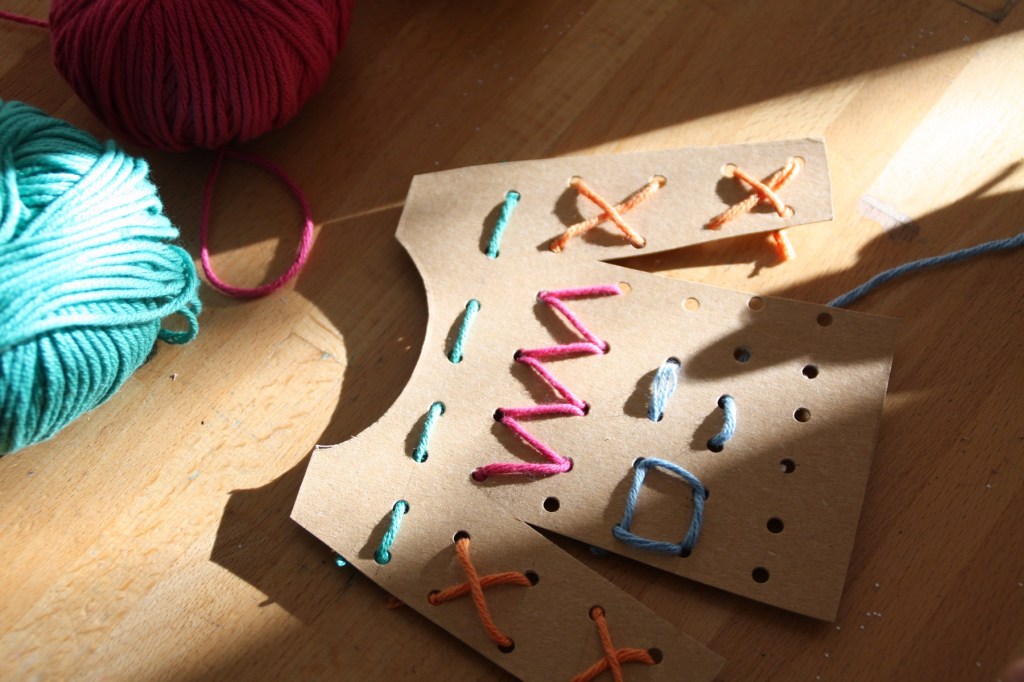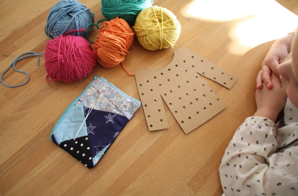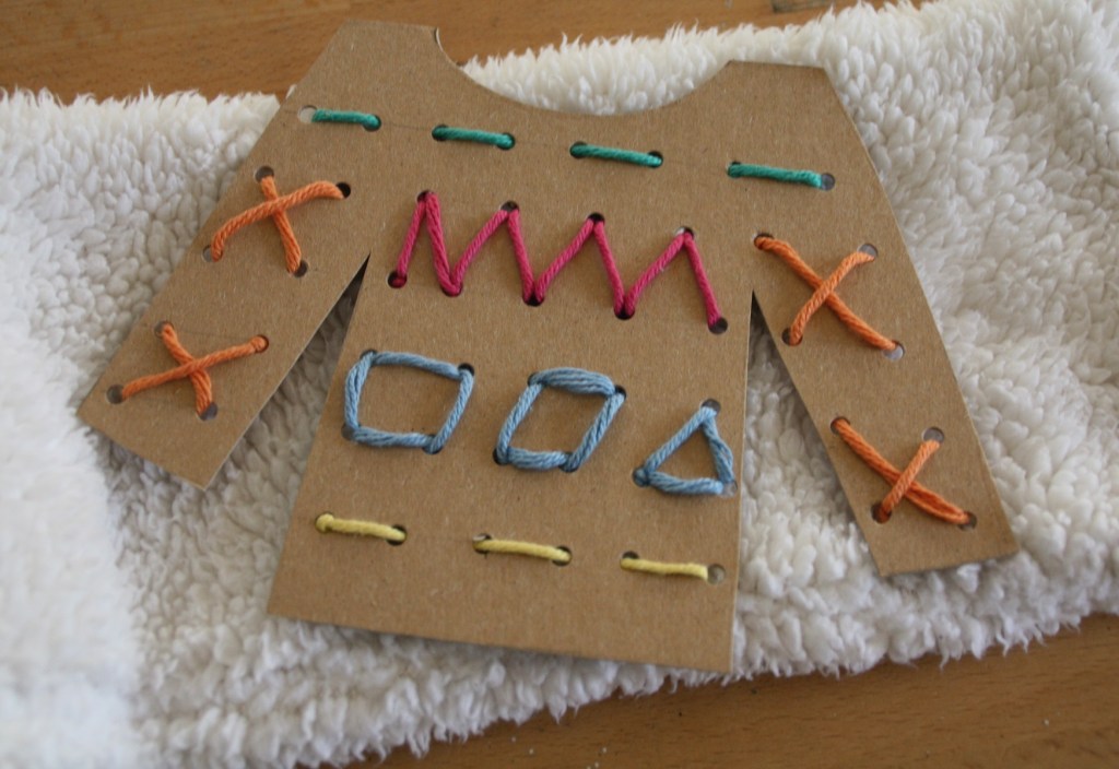 Dans la valise des vacances, il y a un pull coloré. Un morceau de carton, une perforatrice, une aiguille pour enfant et de la laine colorée, voici l’idée d’activité créative.
