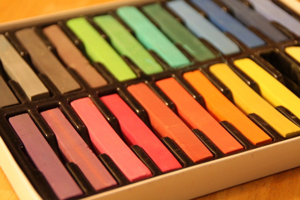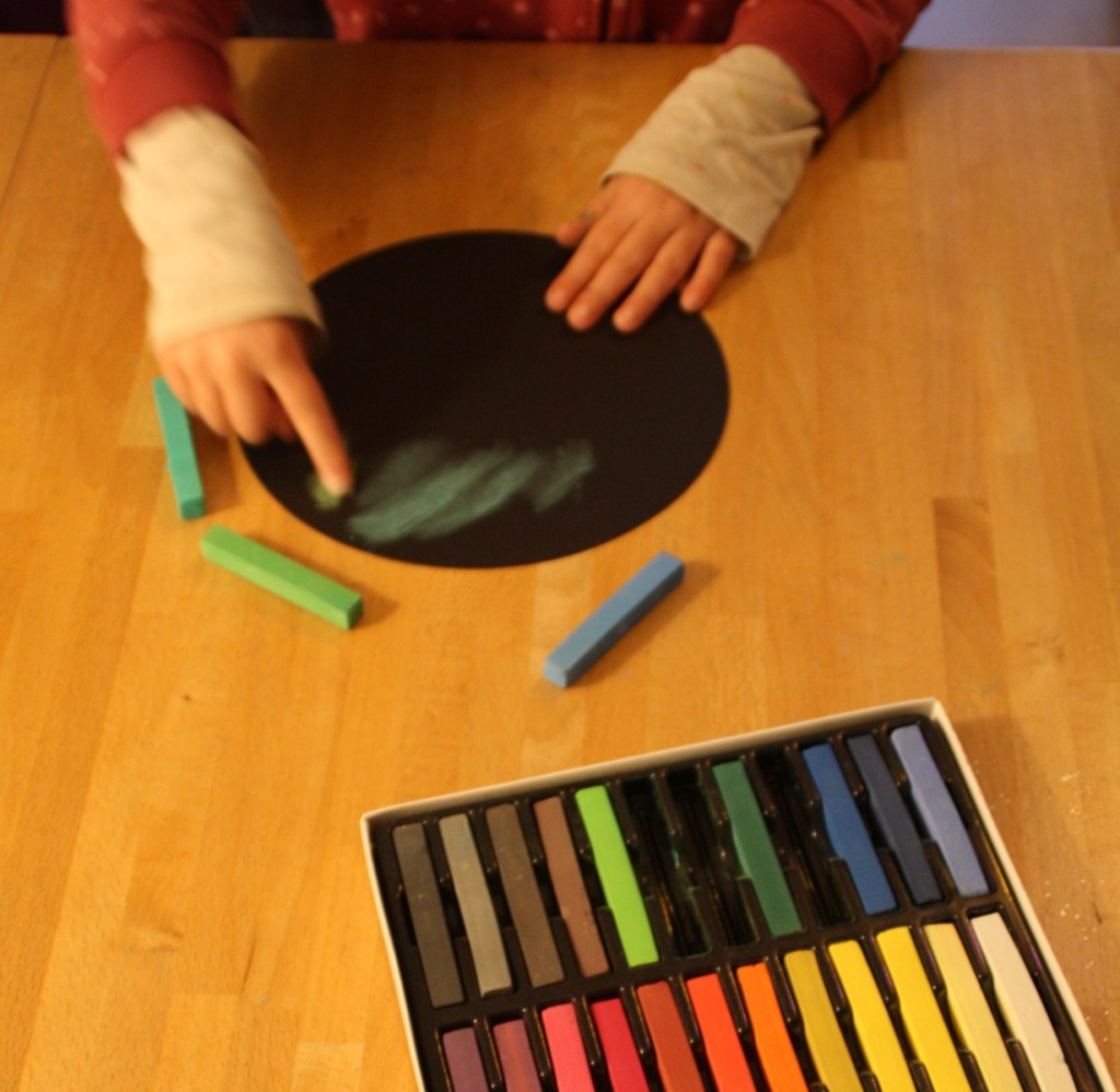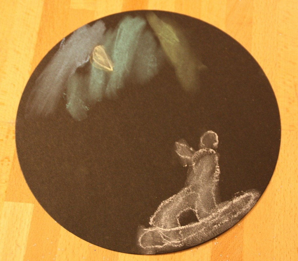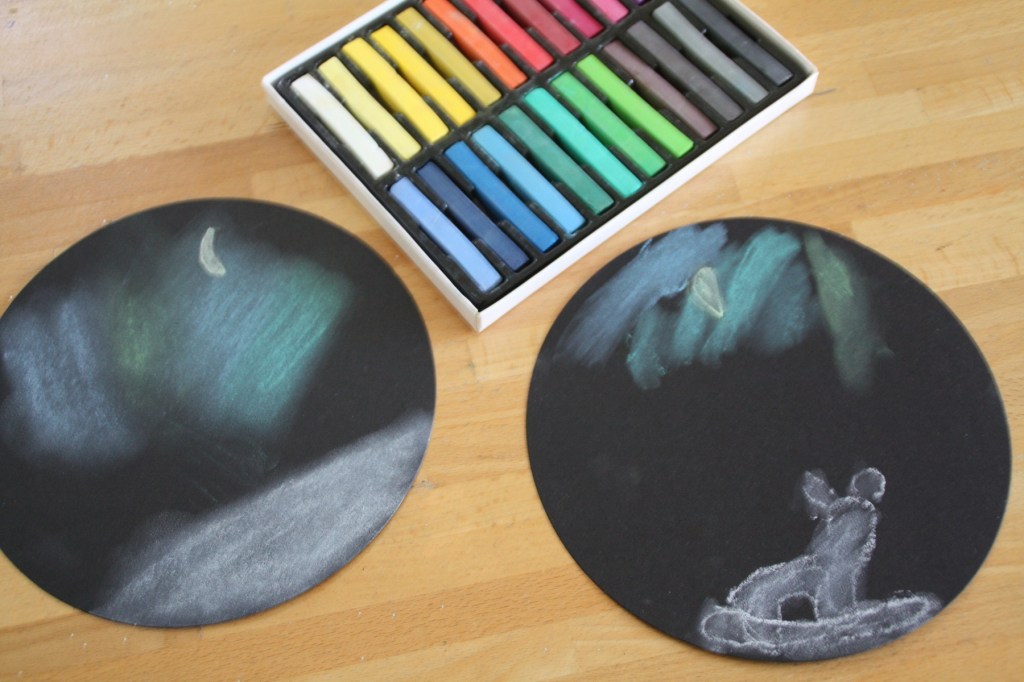 Sur du papier noir, il suffit de faire quelques traits avec des pastels secs dans des coloris verts et bleus et de frotter avec sa main pour recréer ces lueurs dans la nuit. Un croissant de lune, un sol de glace et un ours polaire peuvent compléter le dessin (ma version est celle sans animal).