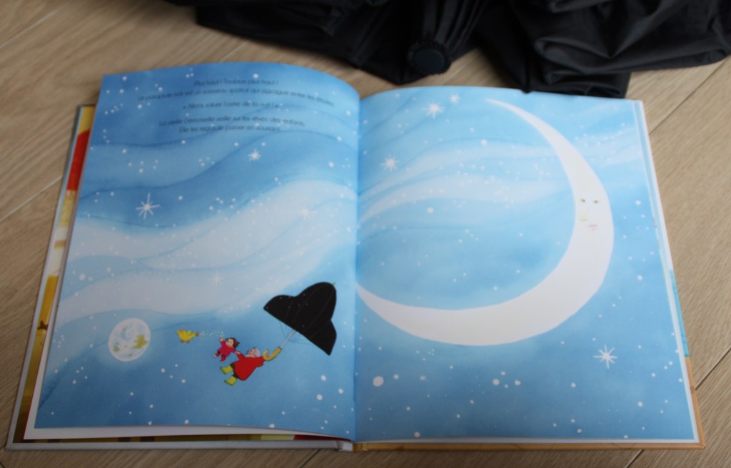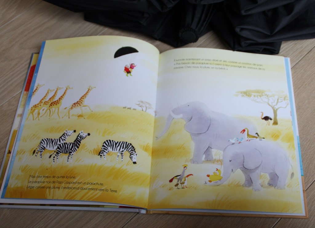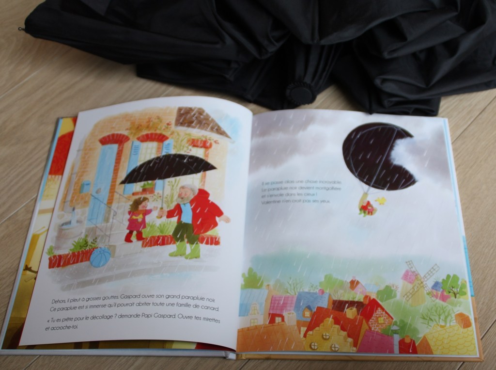 Gaspard, le grand-père de Valentine a un grand parapluie noir, un parapluie extraordinaire qui permet de voyager dans le monde entier et même tout proche de la lune. Se transformant en montgolfière, hélicoptère, fusée ou en bateau pour découvrir l’Afrique, l’Asie ou l’Océanie.