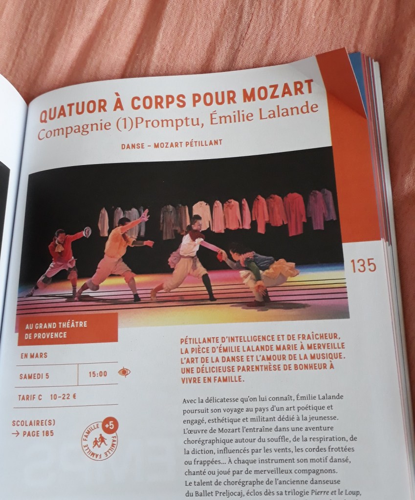 La musique classique ? Par sûr que les enfants apprécient… Mais si, ils vont adorer la musique classique et plus particulièrement Mozart. D’abord à travers un spectacle et puis je vous parlerai d’un livre (probablement demain ou après-demain). Ce n’est pas la première fois que je parle des spectacles de danse imaginés par Emilie Lalande. Il y a eu Pierre et le Loup, L’histoire d’un roi, Wood… et enfin (après une annulation due au virus dont on n’en plus envie d’entendre parler) nous avons pu découvrir Quatuor à corps pour Mozart au Grand Théâtre de Provence.